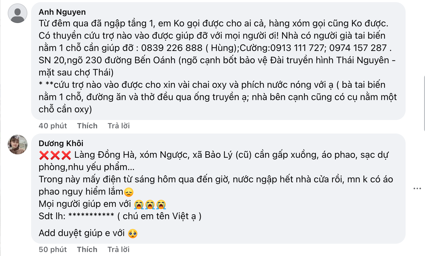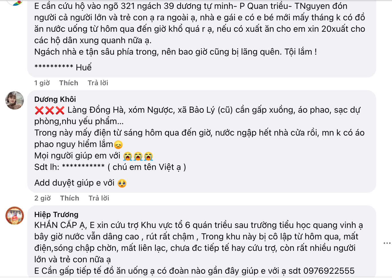 Điều kiện thời tiết, thiên tai phức tạp khiến người dân bị cô lập chỉ còn biết trông đợi vào sự hỗ trợ của các nhóm cứu trợ và lực lượng chức năng. Thông tin liên hệ cứu trợ xuất hiện dày đặc trên các trang mạng xã hội.