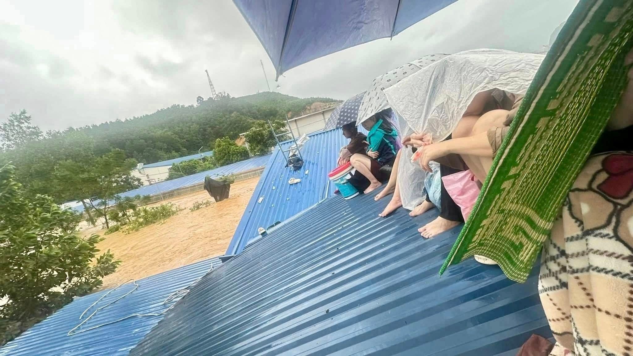 Người dân phải ngồi trên mái nhà giữa mưa để đợi đội cứu hộ. Ảnh: TN Online