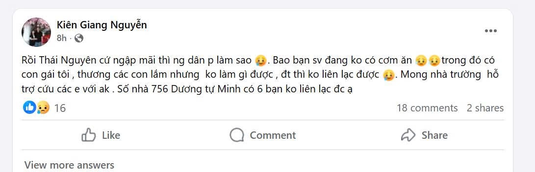 “Rồi Thái Nguyên cứ ngập mãi thì người dân phải làm sao. Bao bạn sinh viên đang không có cơm ăn, trong đó có con gái tôi. Thương các con lắm nhưng không làm gì được, điện thoại thì không liên lạc được. Mong nhà trường hỗ trợ cứu các em với. Số nhà 756 Dương Tự Minh có 6 bạn không liên lạc được”, một phụ huynh kêu cứu trên Facebook.