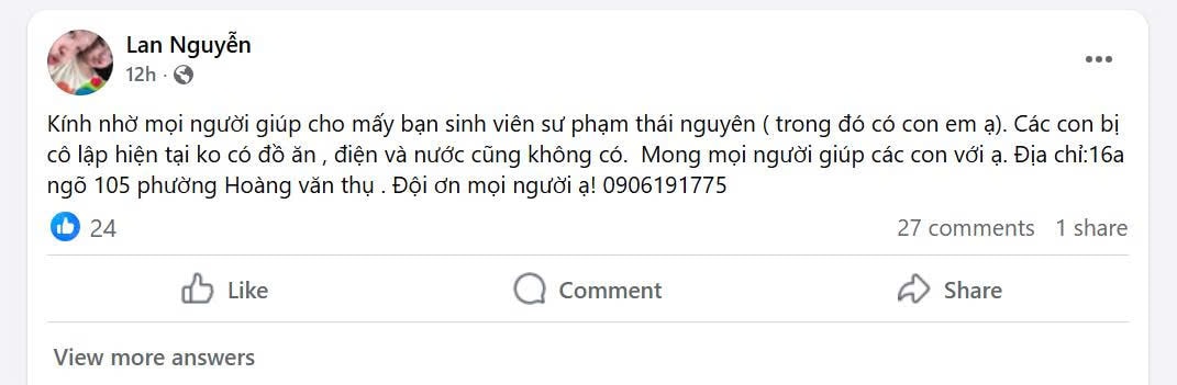 Nhiều bài viết khác tới từ các bậc phụ huynh, người thân của các em ở xa. Nhiều tiếng qua, họ vẫn chưa liên lạc được với con em đang học tại Thái Nguyên bởi mất điện, máy điện thoại các em đều hết pin, trong khi nhà trọ đã bị cô lập, không còn đồ ăn, nước uống.