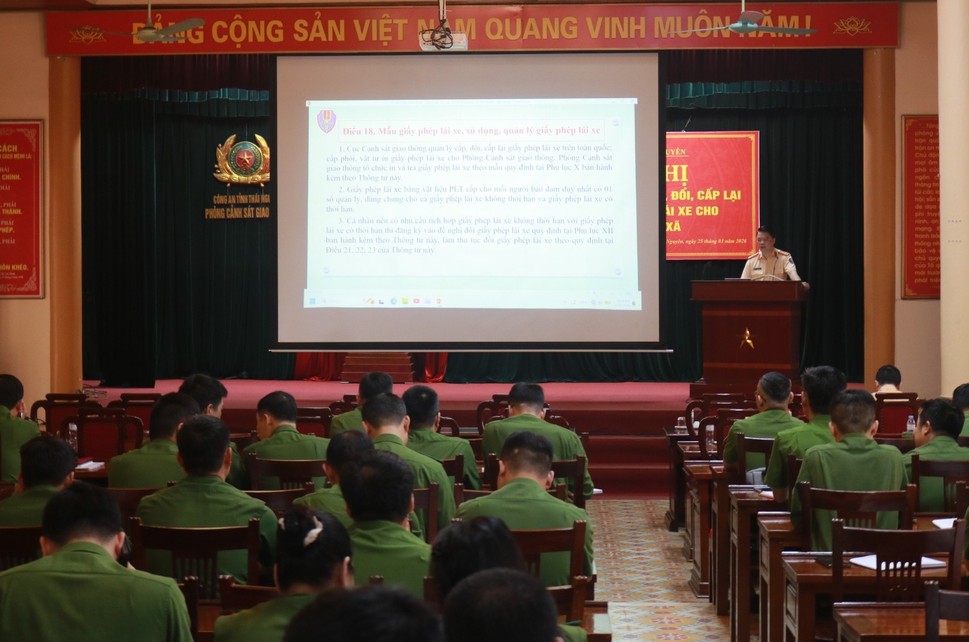 Đại diện Phòng Cảnh sát giao thông, Công an tỉnh Thái Nguyên đã phổ biến hai nội dung tập huấn, bao gồm: Phần lý thuyết tập trung quán triệt các quy định tại Thông tư số 12/2025/TT-BCA, ngày 28/02/2025 của Bộ Công an quy định về sát hạch, cấp giấy phép lái xe; cấp và sử dụng giấy phép lái xe quốc tế. Phần thực hành hướng dẫn cán bộ, chiến sĩ quy trình thực hiện trên phần mềm quản lý sát hạch, cấp giấy phép lái xe; thao tác cấp đổi, cấp lại giấy phép lái xe trên hệ thống dịch vụ công trực tuyến; thực hành trực tiếp trên máy tính.