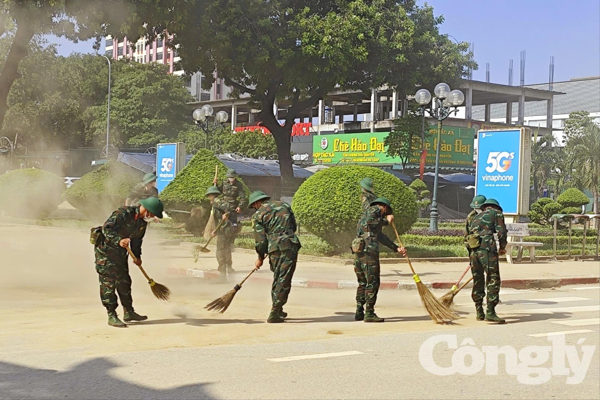 Hàng trăm cán bộ, chiến sĩ của Trung đoàn 209 và Lữ đoàn 210 đã tham gia dọn dẹp vệ sinh môi trường tại khu vực trung tâm hành chính tỉnh sau khi nước lũ rút.