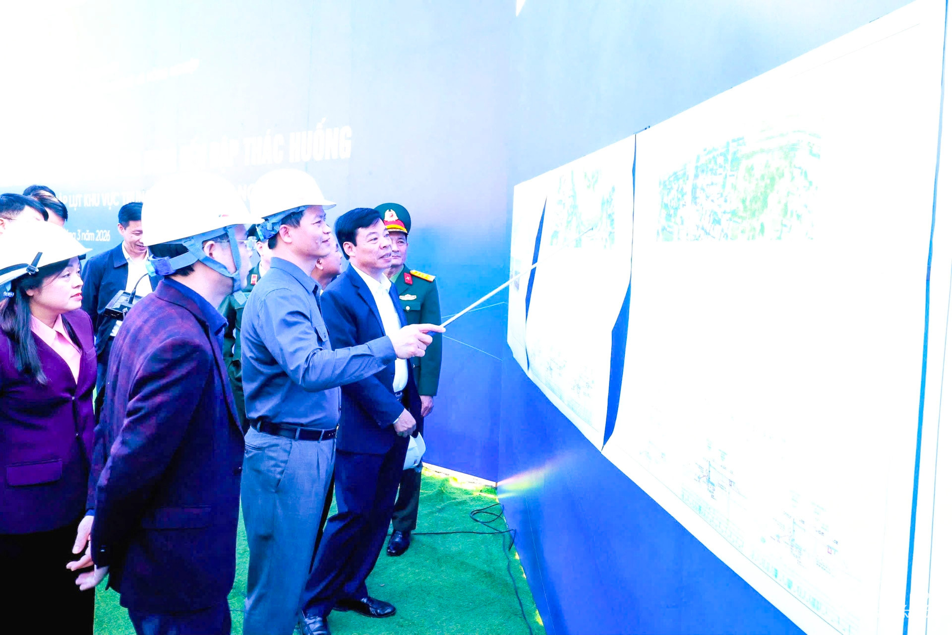 Lãnh đạo tỉnh Thái Nguyên quan sát thực tế bản vẽ thiết kế công trình.
