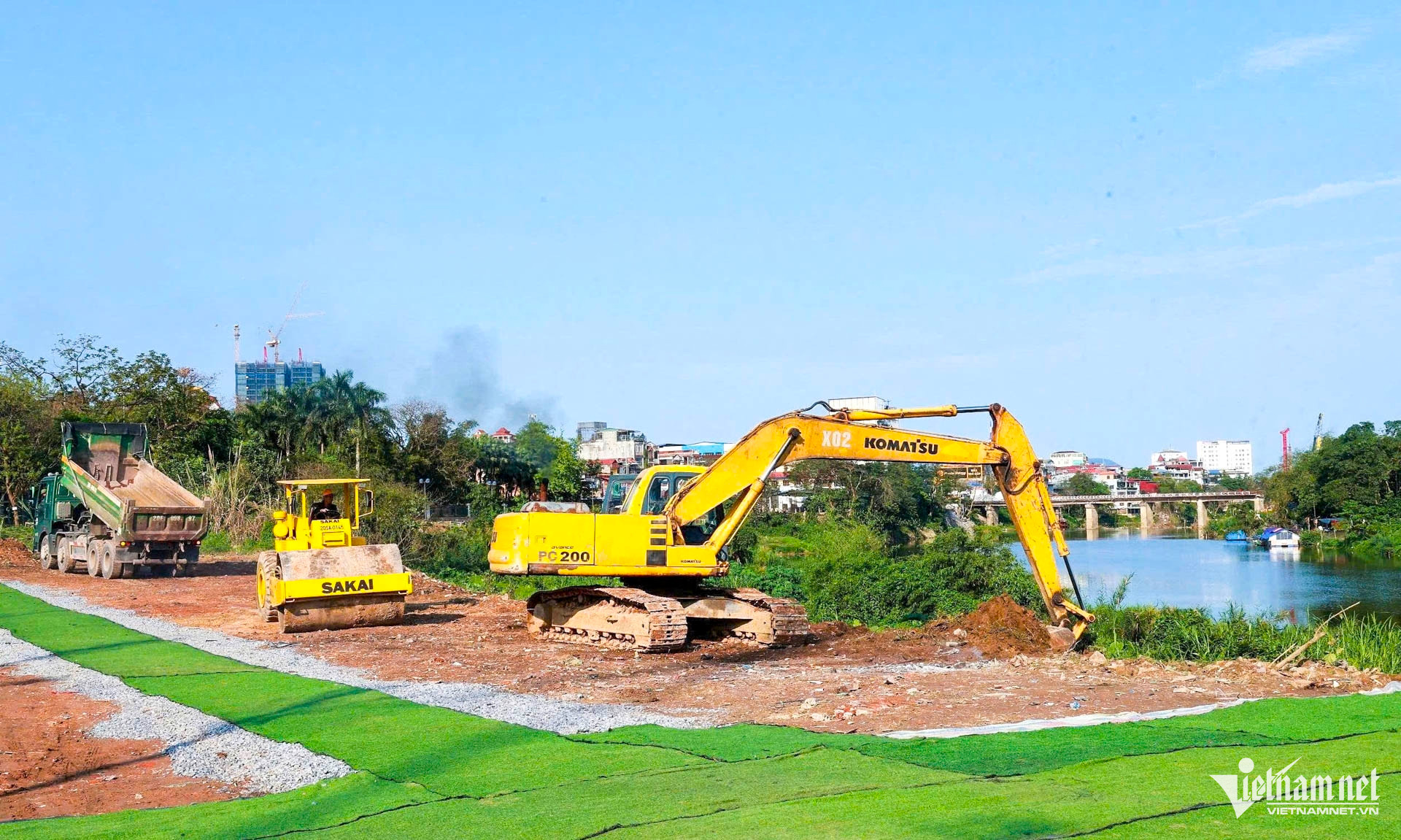 Phương tiện máy móc được huy động để thi công công trình.