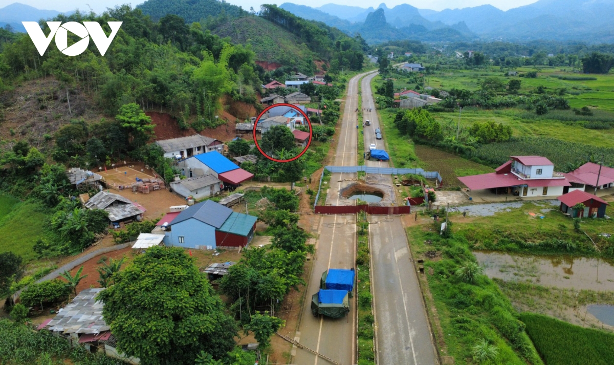 Vị trí ngôi nhà bà Lý Thị Thùy thời điểm xuất hiện hố sụt lún trên Quốc lộ 3B (Tháng 6/2025)