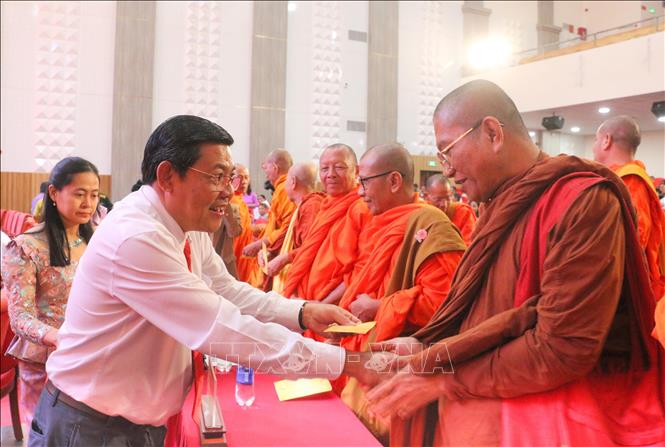 Phó Chủ tịch UBND tỉnh An Giang Ngô Công Thức tặng quà, lì xì năm mới những người có uy tín, chức sắc tôn giáo người dân tộc Khmer trên địa bàn. Ảnh: Công Mạo/TTXVN