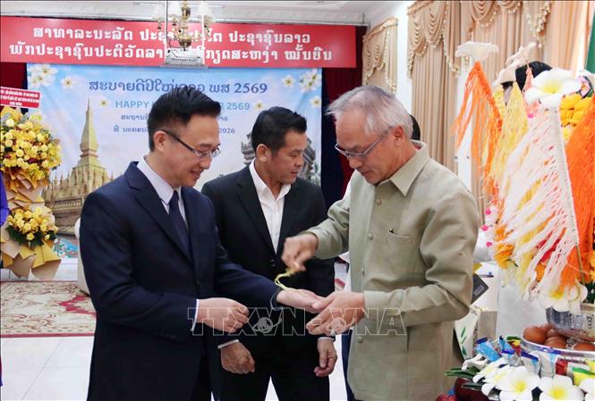 Ông Phonesy Bounmixay (phải), Tổng lãnh sự Lào tại Thành phố Hồ Chí Minh thực hiện nghi thức buộc chỉ cổ tay chúc phúc nhân dịp năm mới cổ truyền của Lào cho ông Đặng Minh Thông (trái), Phó Bí thư Thành ủy Thành phố Hồ Chí Minh. Ảnh: Xuân Khu/TTXVN