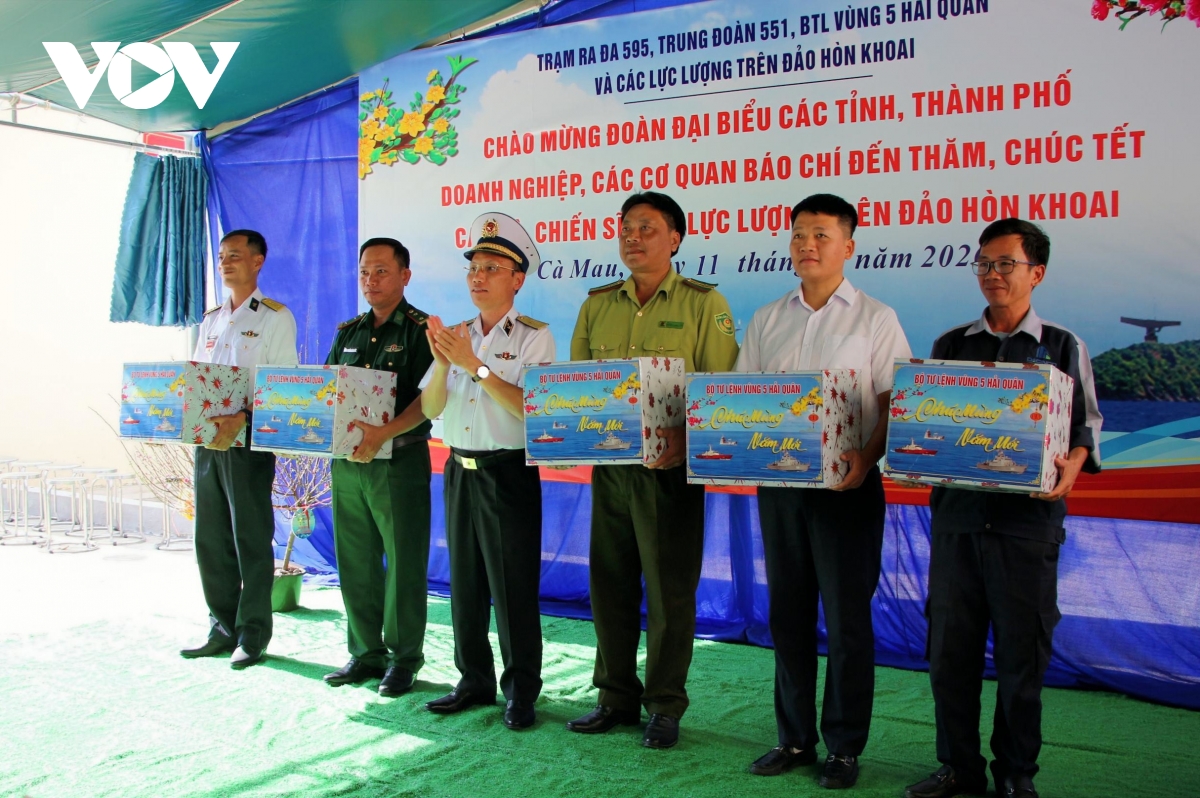 Tiếp tục chuyến thăm, chúc Tết, tặng quà, động viên đến cán bộ, chiến sĩ, nhân dân các đảo trên vùng biển Tây Nam của Tổ quốc, chiều 11/1, Đoàn công tác của Bộ Tư lệnh vùng 5 Hải quân và các đoàn đại biểu các tỉnh, thành phố, doanh nghiệp, cơ quan báo chí đã đến cụm đảo Hòn Khoai, tỉnh Cà Mau.