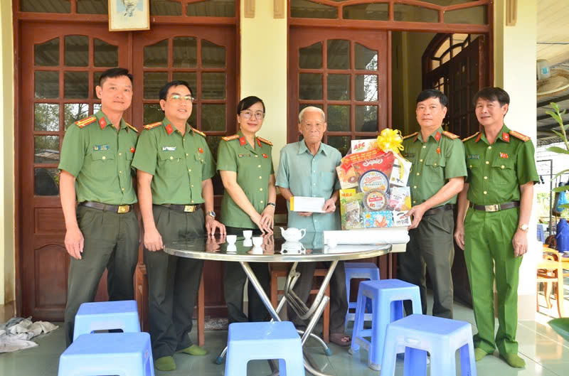 Đại tá Võ Thị Hoài Ngọc, Tỉnh ủy viên, Phó Bí thư Đảng ủy, Phó Giám đốc Công an tỉnh (thứ 3 từ trái sang) thăm hỏi, tặng quà tri ân các đồng chí nguyên lãnh đạo Công an tỉnh.