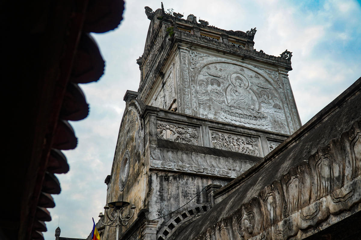 Chính điện có kết cấu mái vòm cao, tường gạch kiên cố, các cột trụ lớn, gợi dáng dấp của nhà thờ châu Âu nhưng vẫn đậm nét Phật giáo qua những họa tiết rồng, phượng, hoa sen, mái cong đầu đao. Ảnh: Đình Minh
