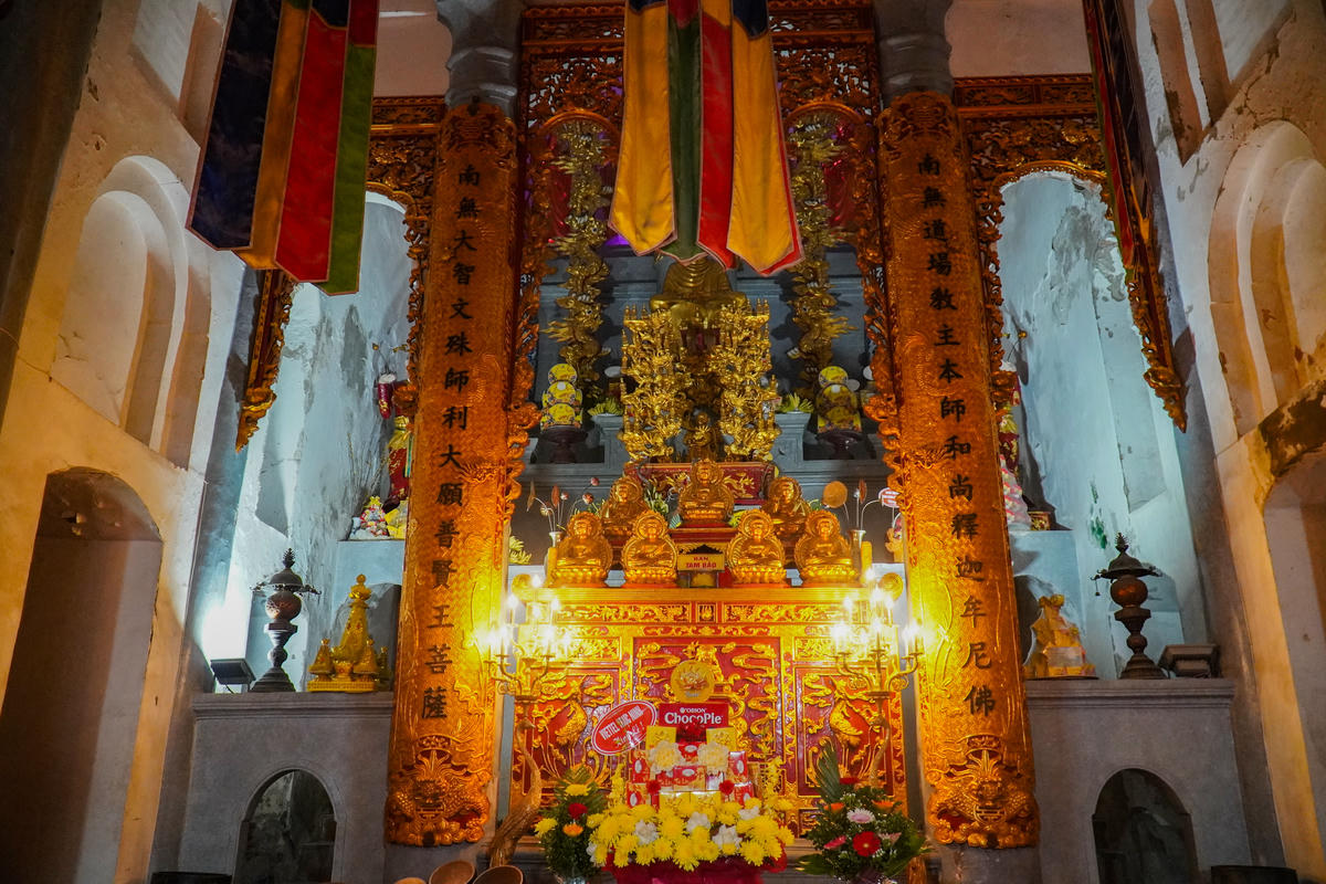 Tòa Chính cung bên trong ngôi chùa cao 29m, là nơi tôn thờ Phật và Đức Thánh Tổ Nguyễn Minh Không với mái vòm cao, gợi nhớ tới dáng dấp của một thánh đường Ki-tô giáo với lối kiến trúc Gothic. Ảnh: Đình Minh