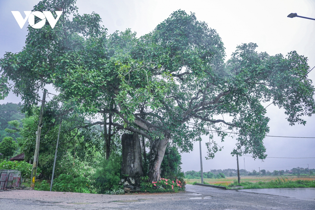 Đường dẫn vào chùa Địa Tạng Phi Lai có phiến đá khắc tên chùa được đặt dưới một cây đa cổ thụ.