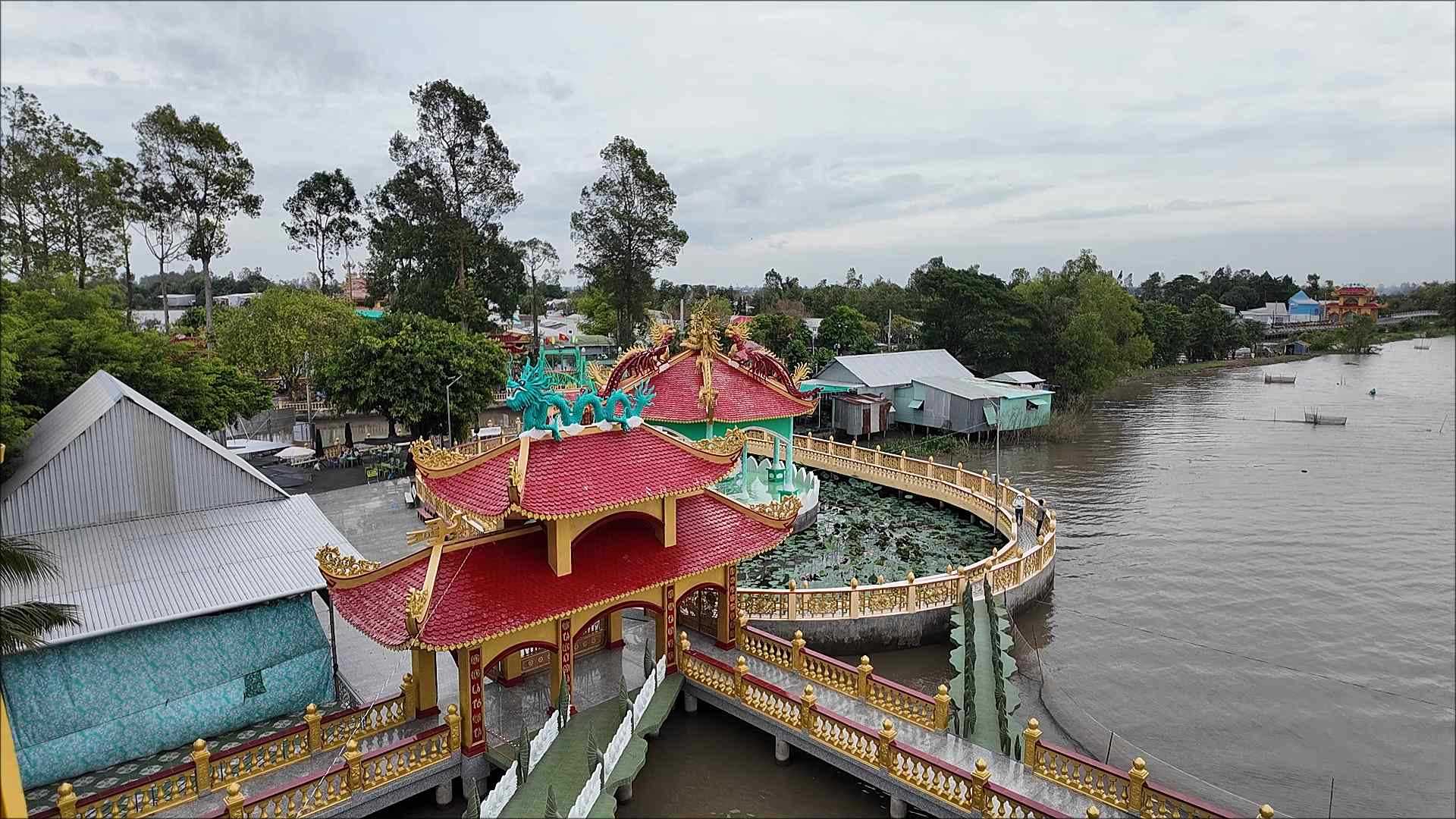 Trung tâm khu di tích là Chánh điện, được xây dựng theo phong cách truyền thống Nam Bộ, với mái ngói cong và các hoa văn trang trí cổ điển. Từ đây, du khách có thể quan sát toàn cảnh khuôn viên với lối đi rợp bóng cây và mặt nước phẳng lặng mùa lũ. Ảnh: Bảo Phong