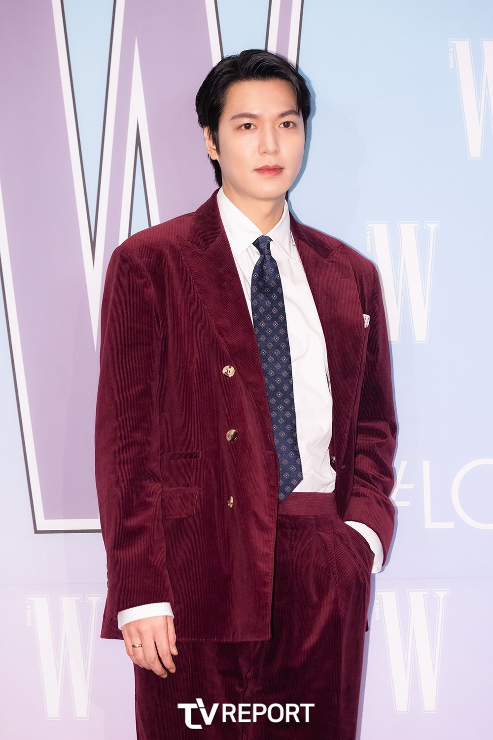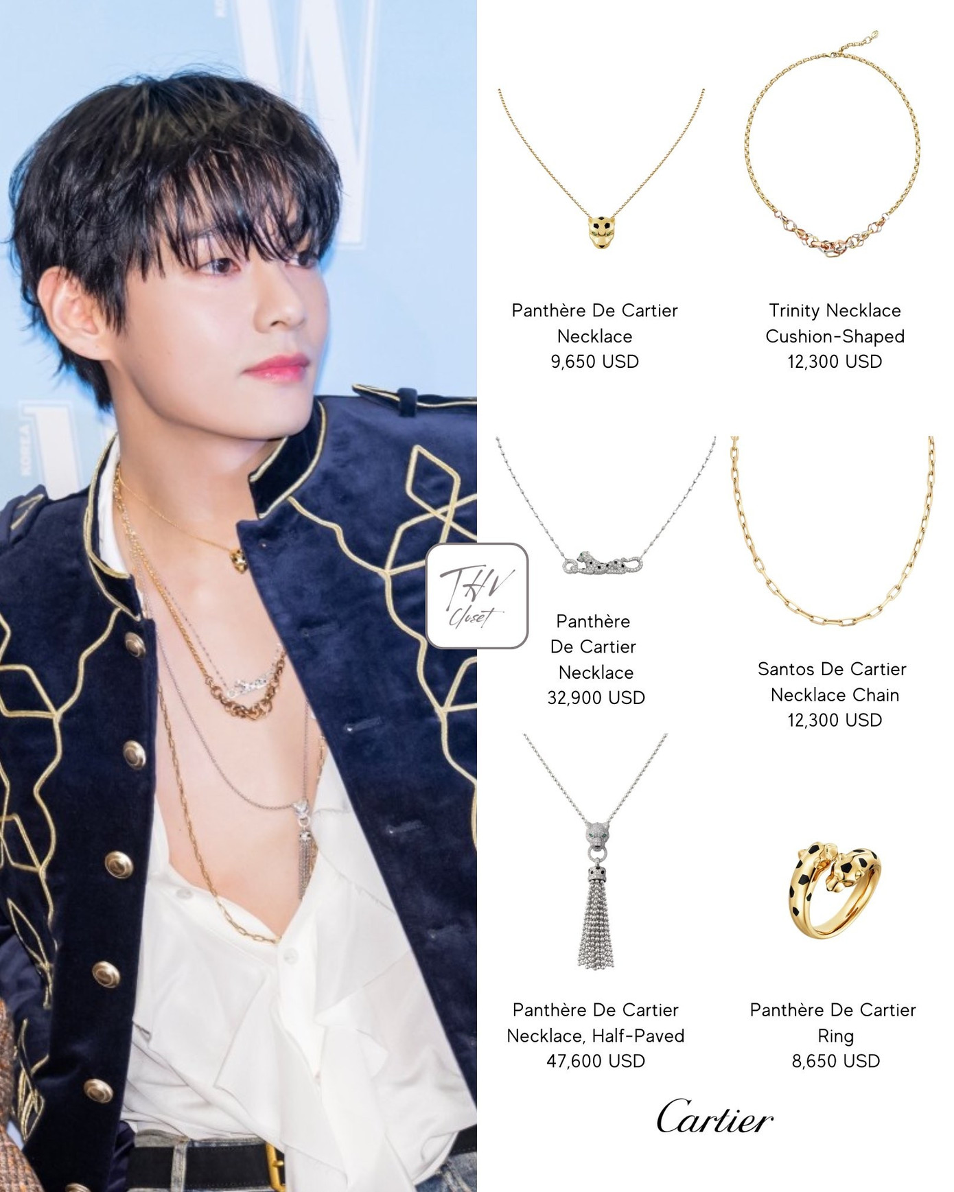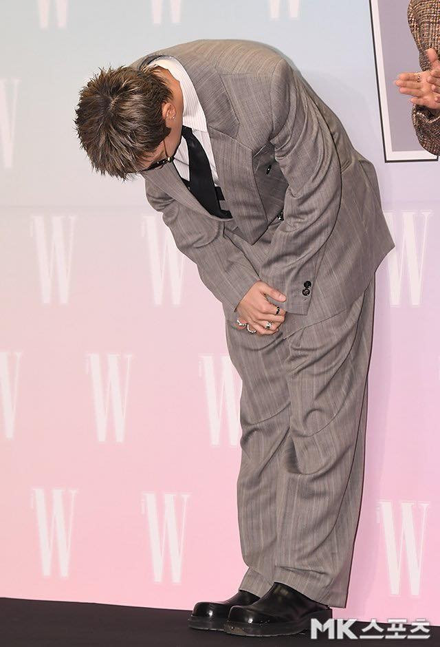 V hút thảo luận lớn nhờ tạo hình trang phục có phần cổ khoét sâu táo bạo. Anh mặc xanh navy được thiết kế riêng bởi Jay Baek Couture cùng loạt trang sức từ Cartier có tổng giá trị hơn 3,1 tỷ đồng.