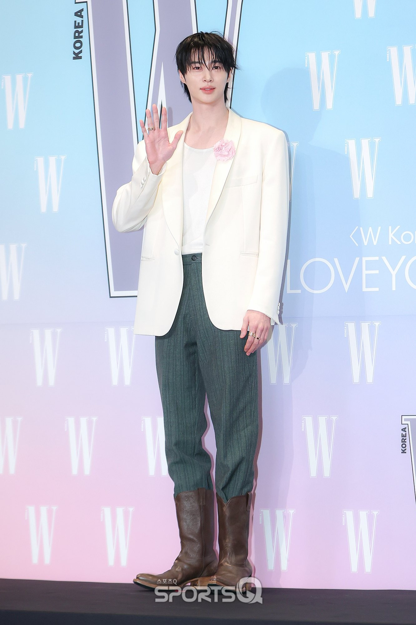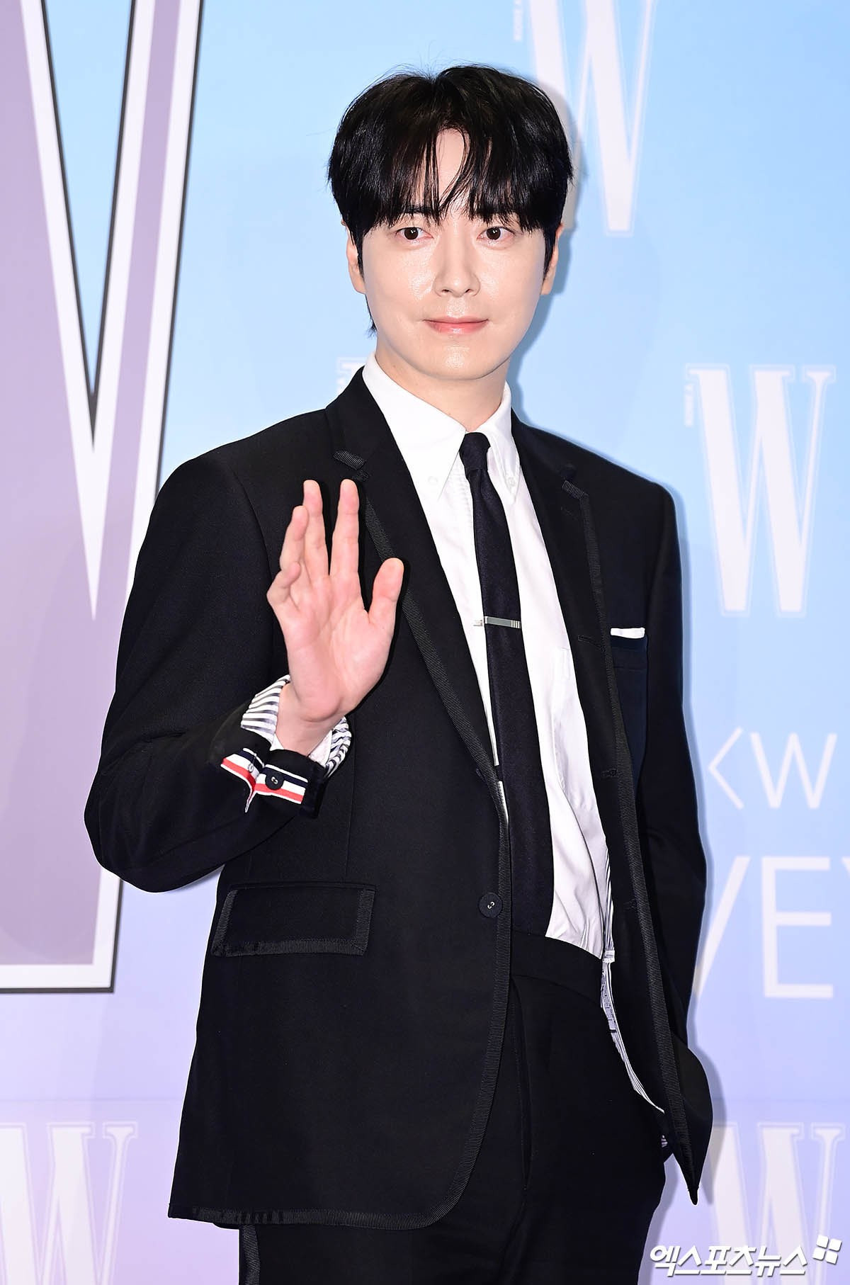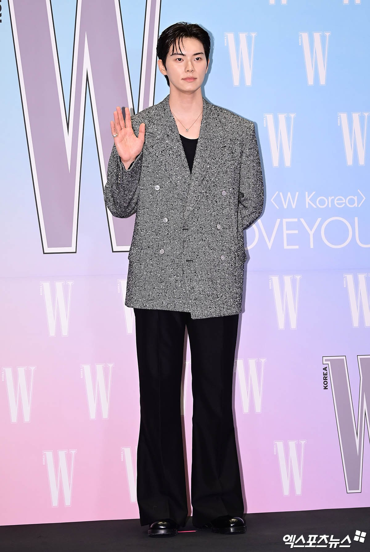 ghi điểm nhờ diện mạo điển trai, tươi sáng. Nam chính diện trang phục của nhà mốt do anh làm đại sứ, tạo điểm nhấn với kiểu tóc vuốt ướt.