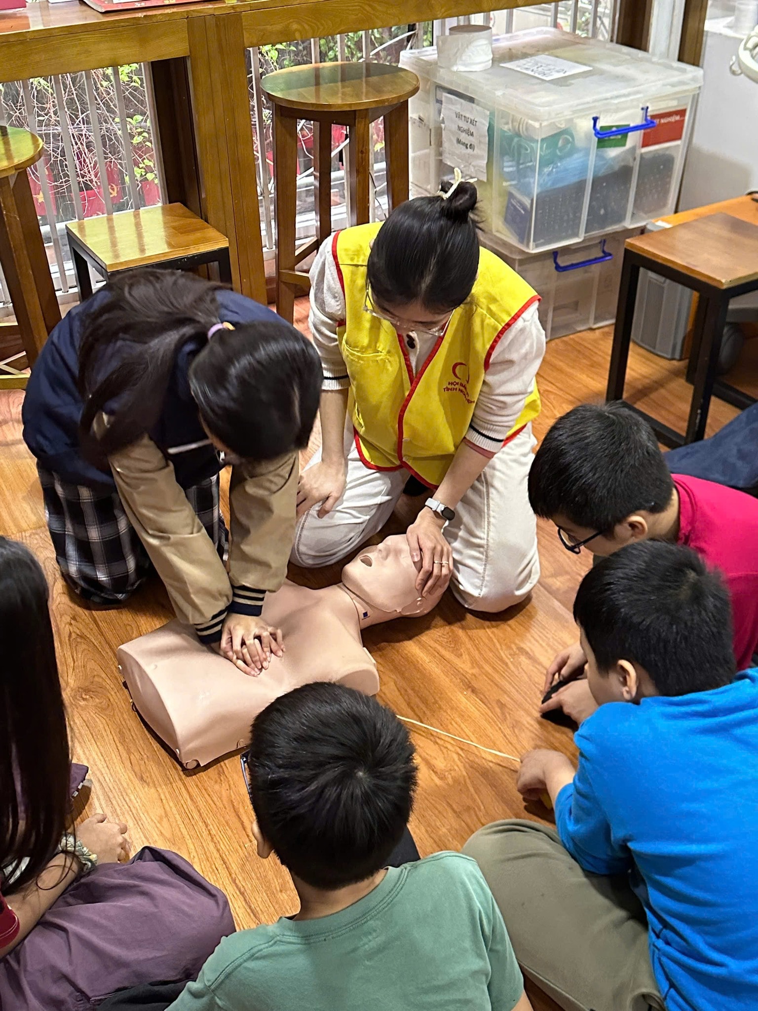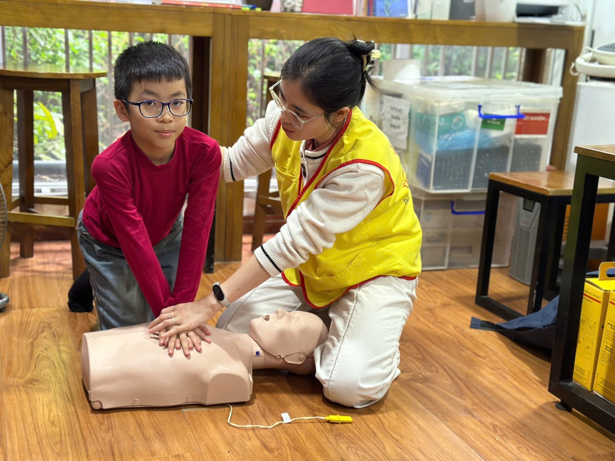 Trong suốt buổi học, các con được thực hành trực tiếp trên mô hình và đóng vai tình huống thực tế: – Cách nhận biết dấu hiệu nguy hiểm khi sốt – Xử trí nhanh khi gặp trường hợp đuối nước – Từng bước ép tim – thổi ngạt đúng kỹ thuật trong CPR.