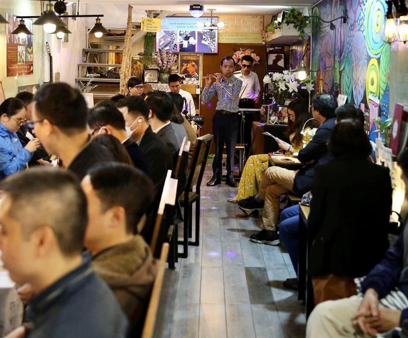 Không chỉ dừng lại ở những buổi thăm khám ban ngày, quán cà phê còn trở thành điểm hẹn định kỳ của những đêm nhạc Trịnh mang tên "Đêm nhạc từ trái tim" khi đêm xuống.