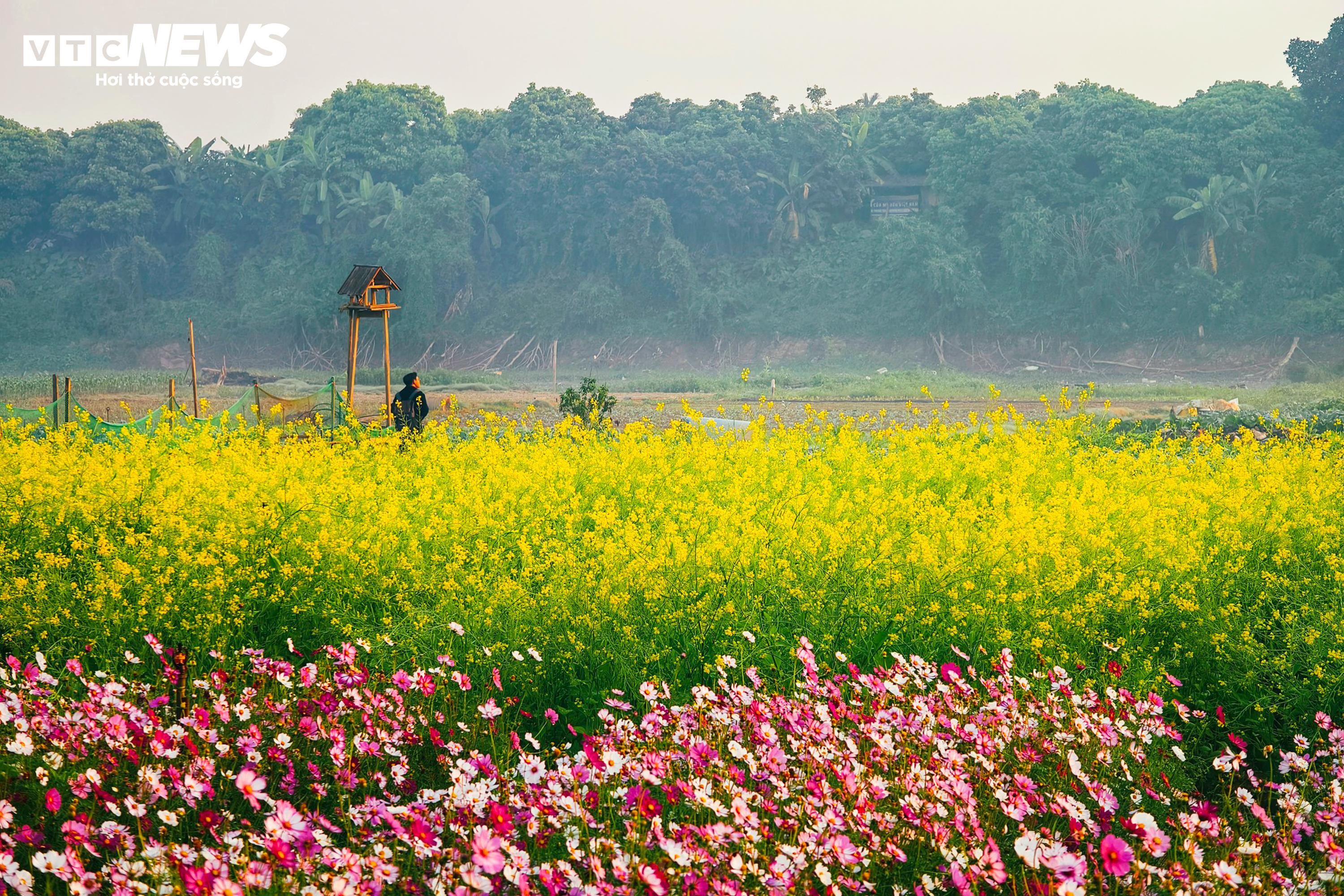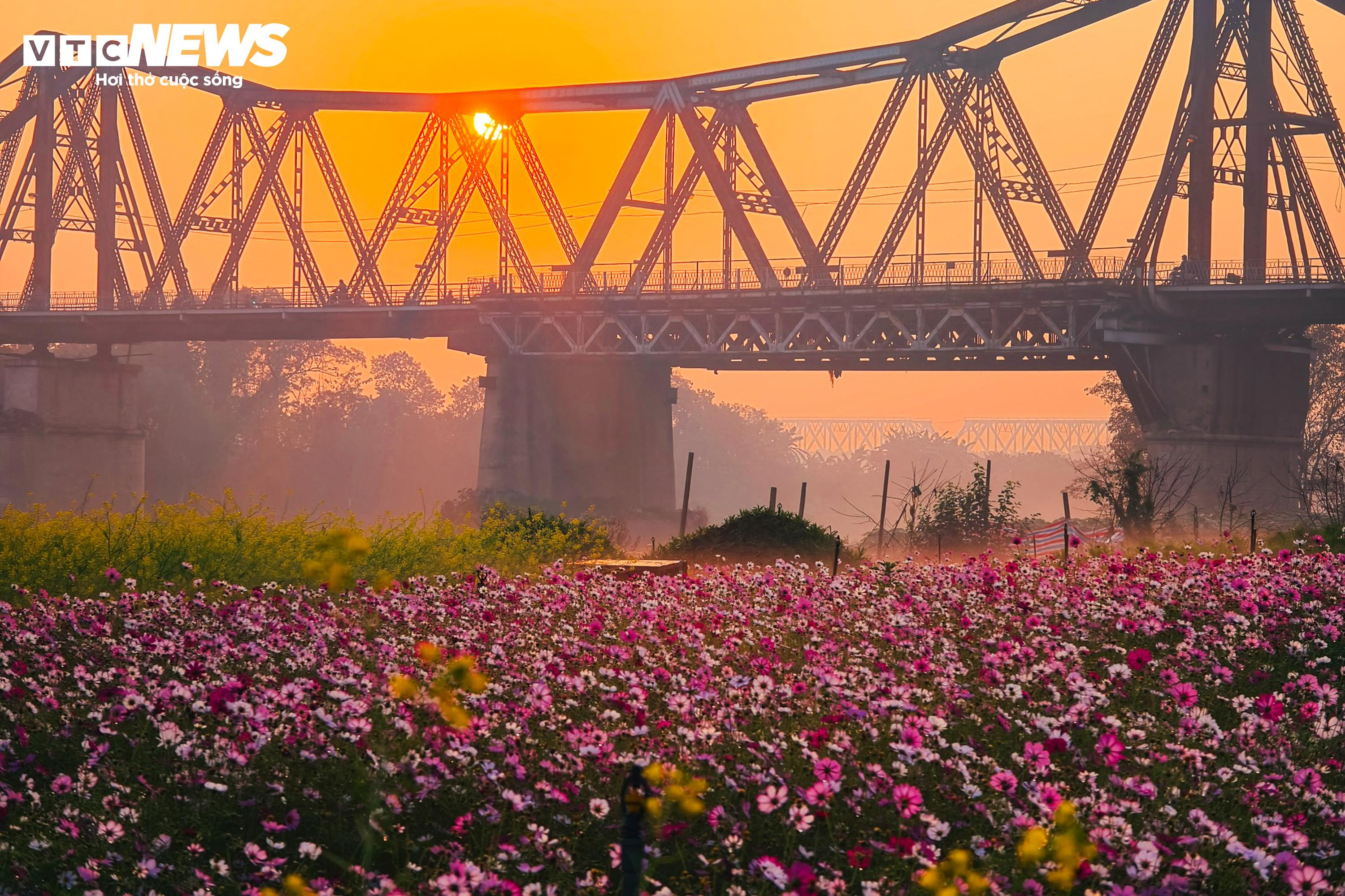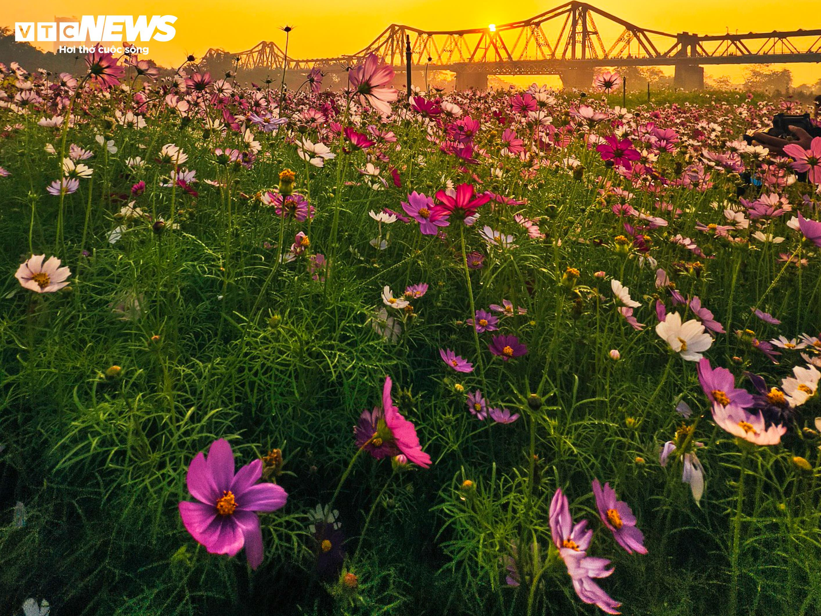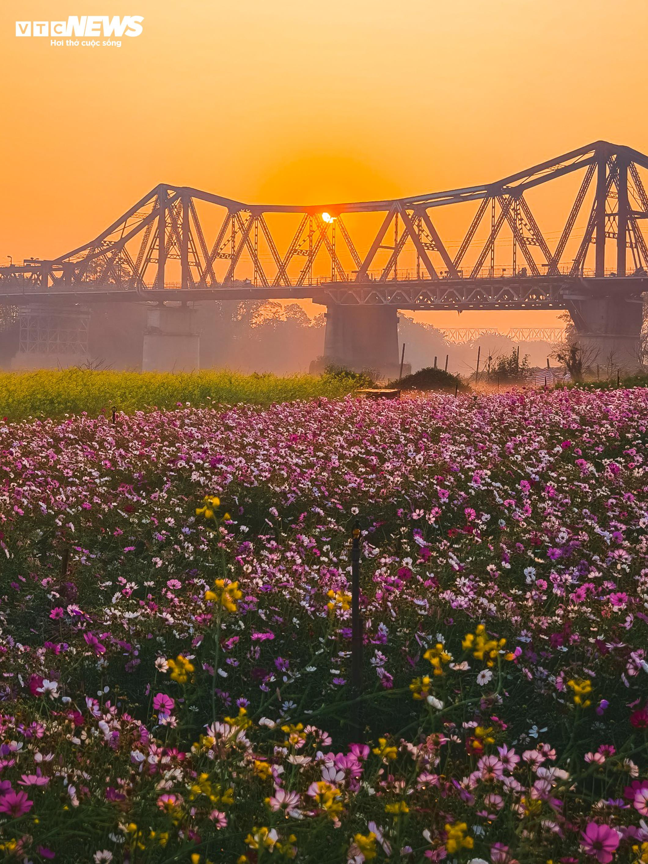Khu đất ven sông từng là bãi trống nay được người dân cải tạo, trồng hàng ngàn gốc hoa. Các luống hoa được sắp xếp thành từng dải kéo dài, phủ kín một vùng rộng lớn dưới chân cầu.