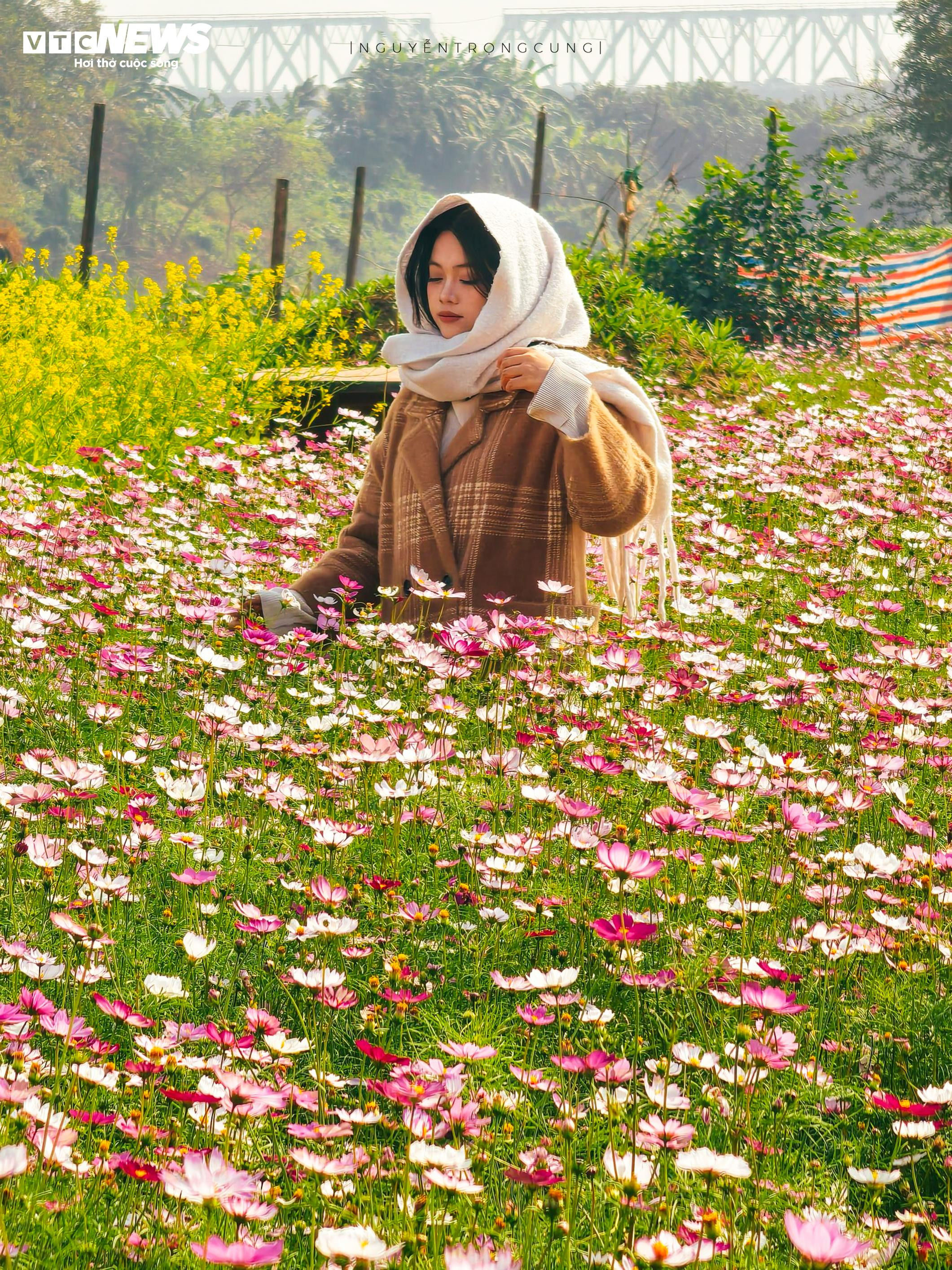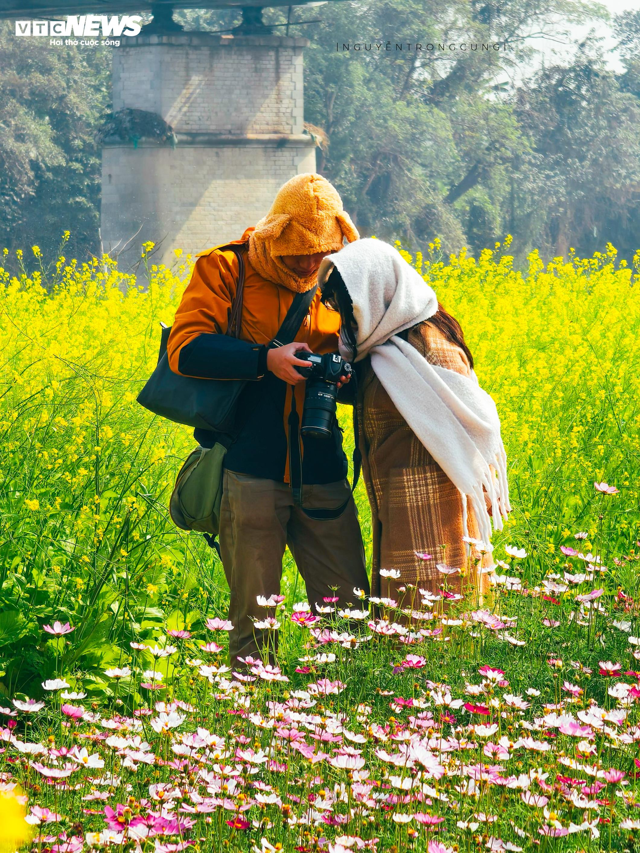 Sự xuất hiện của thảm hoa cũng khiến nơi đây trở thành điểm chụp ảnh được giới trẻ và những người yêu nhiếp ảnh lựa chọn. Phông nền là những luống hoa rực rỡ, phía trên là cây cầu Long Biên mang dấu ấn thời gian, tạo nên khung hình vừa gần gũi, vừa đặc trưng của Hà Nội.