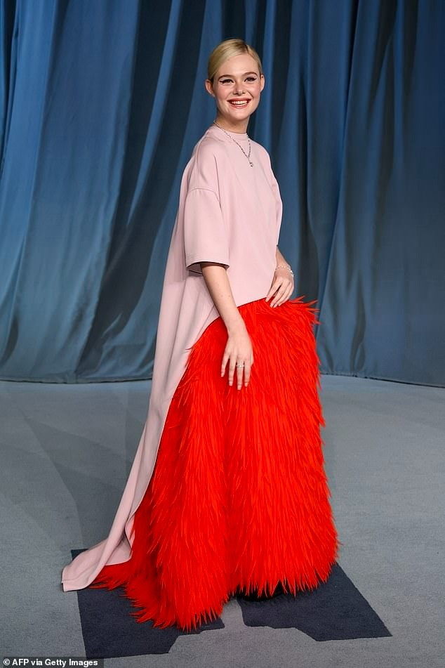 Elle Fanning mặc thiết kế của Balenciaga. Cô bị chê vì phần lông vũ đỏ ở thân dưới khá kỳ quái, không ăn khớp với thân trên khá thanh lịch. Daily Mail nhận xét khi chụp ảnh góc nghiêng, phần lông vũ như được đắp vụng về vào. Ảnh: WireImage.