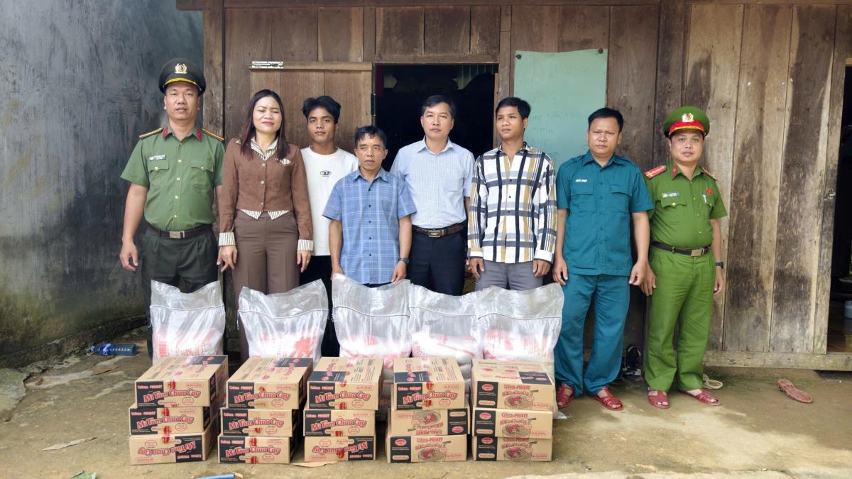 Lãnh đạo xã cùng Công an xã tặng quà cho Ban nhân dân, bà con nhân dân thôn A ur