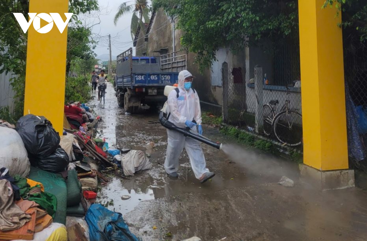 Lực lượng y tế phun khử khuẩn vệ sinh môi trường để phòng dịch bệnh bùng phát sau lũ