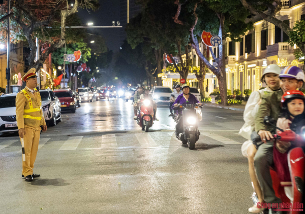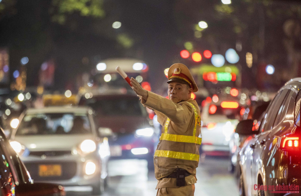 Hơn 22h đêm 16/2 (tức 29 Tháng Chạp), những ngả đường đổ về trung tâm Thủ đô Hà Nội ngày một đông hơn. Người dân và du khách xúng xính áo quần tập trung về quanh hồ Hoàn Kiếm, Quảng trường Lý Thái Tổ để vui chơi, chụp ảnh... chờ đón thời khắc đầu tiên của năm mới Bính Ngọ 2026 đã gần kề. Trong ảnh, cán bộ Đội CSGT số 1 làm nhiệm vụ tại khu vực Hai Bà Trưng - Hàng Bài (phường Cửa Nam, Hà Nội).