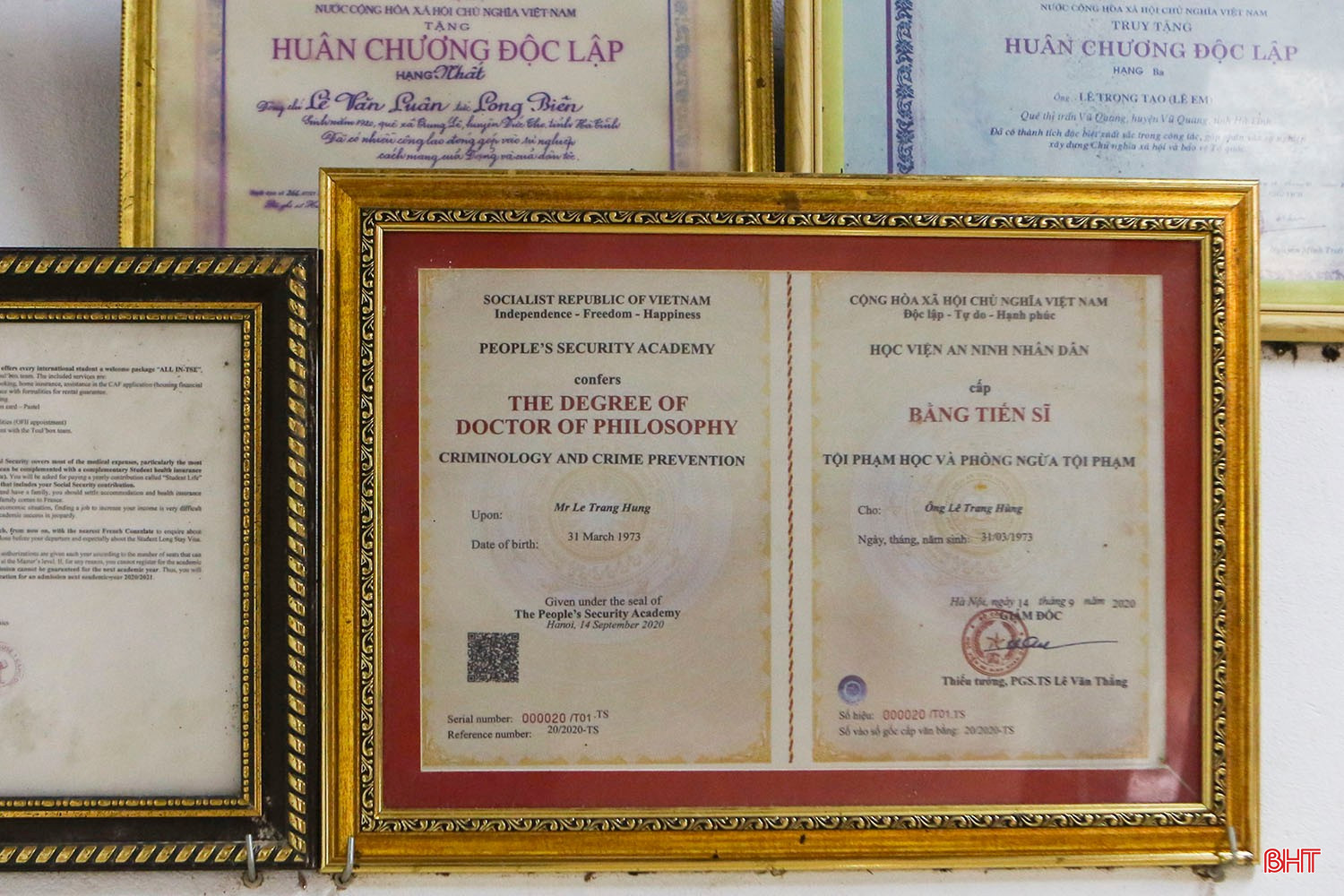 ... ngày nay, con cháu dòng họ Lê làng Trung Lễ cũng không ngừng nỗ lực phấn đấu học tập, lao động xây dựng đất nước. Đến nay, làng Trung Lễ đã có hơn 45 giáo sư, tiến sĩ trên nhiều lĩnh vực, trong đó dòng họ Lê đóng góp số lượng lớn. Ảnh: Một số bằng tiến sĩ của con cháu dòng họ Lê được trưng bày tại nhà truyền thống dòng họ.
