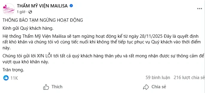 Tối 27/11/2025, trên fanpage chính thức, hệ thống Mailisa phát đi thông báo sẽ tạm ngừng hoạt động toàn hệ thống từ ngày 28/11/2025. Trong thông báo, đơn vị này mô tả quyết định là “rất khó khăn”, đồng thời gửi lời xin lỗi tới khách hàng và mong nhận được sự thông cảm. Thông báo được đưa ra trong thời điểm hệ thống thẩm mỹ này đang liên quan đến vụ án buôn lậu mỹ phẩm.