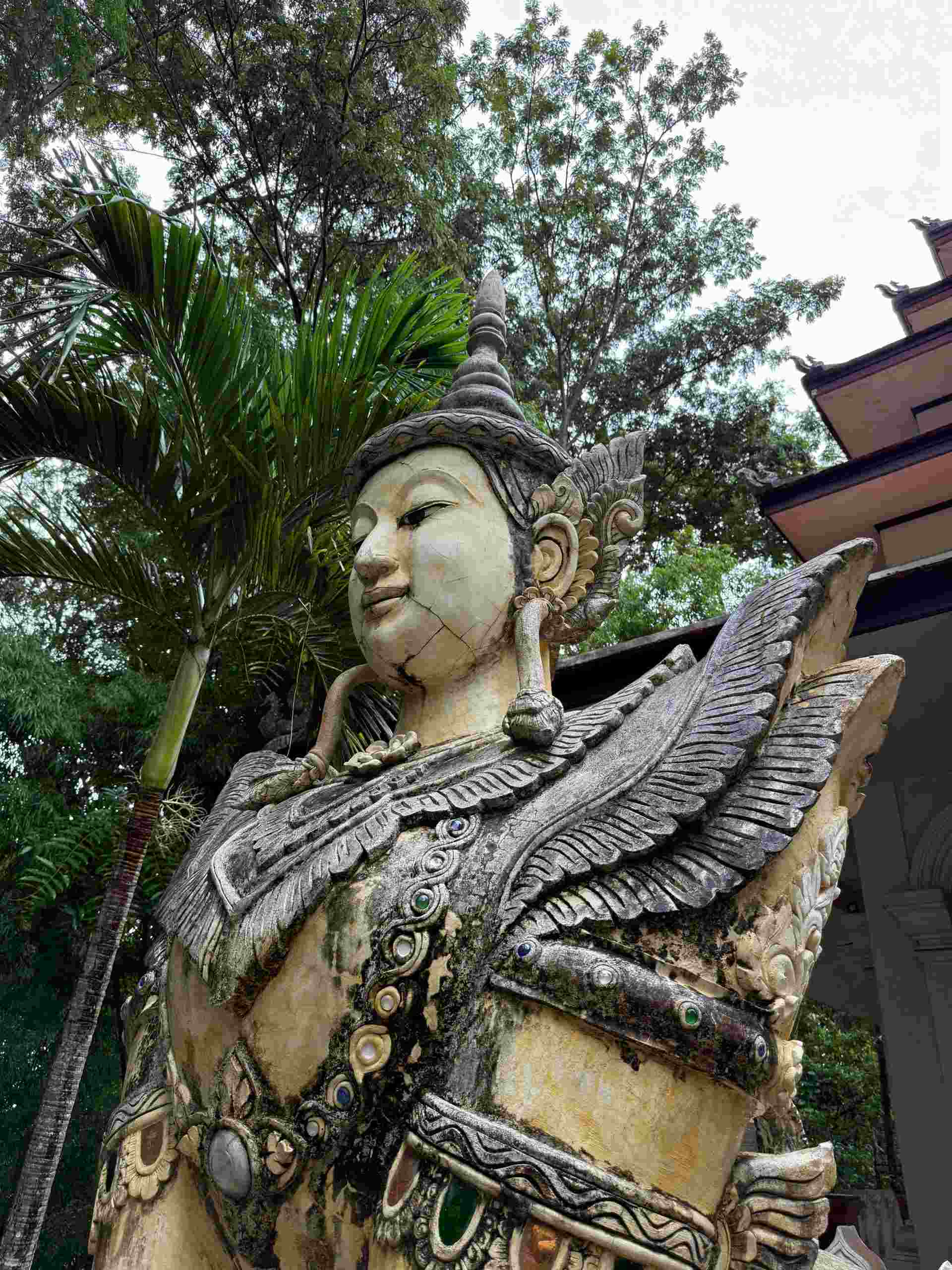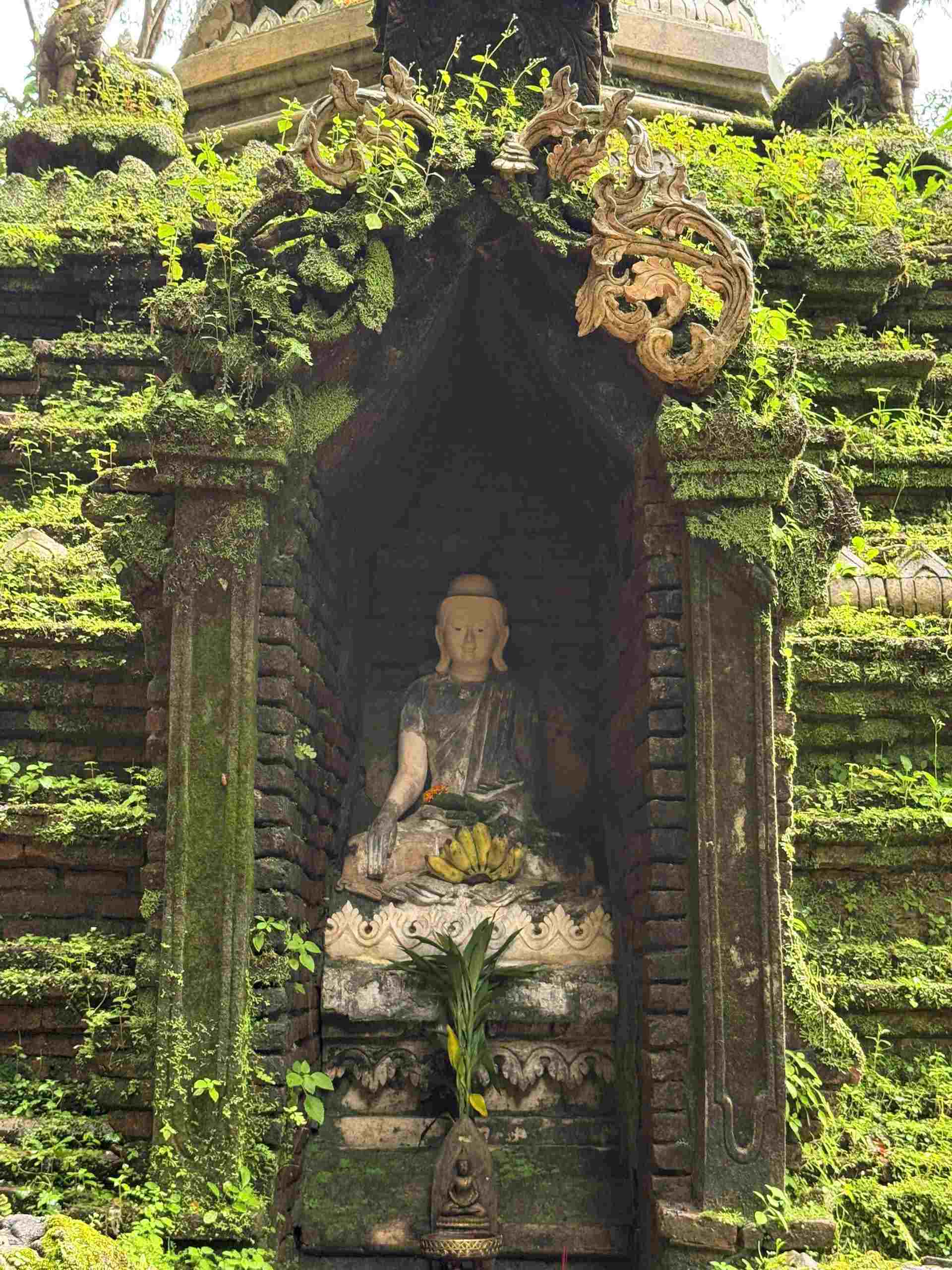 Một công trình đáng chú ý khác là bảo tháp Phra Borommathat mang phong cách Miến Điện, phủ rêu và thảm thực vật, tạo cảm giác cổ kính, trầm mặc. Ảnh: Ryan Nguyễn