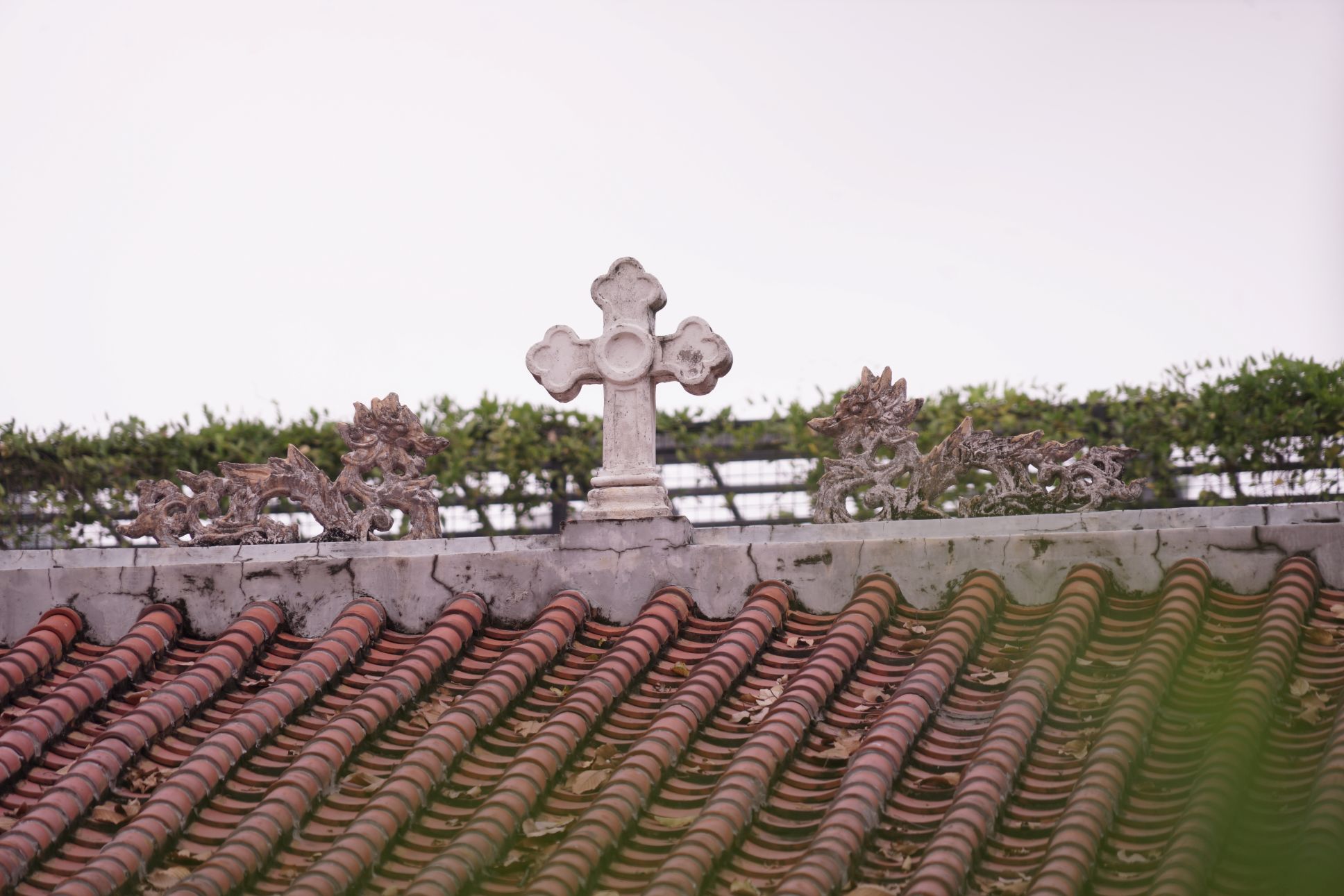 Trên mái nhà có phù điêu hình hai con rồng chầu Thánh giá. Về ý nghĩa của bức phù điêu trên, có nhà nghiên cứu cho rằng đó là sự kết hợp giữa hình tượng của tôn giáo phương Tây buổi đầu hội nhập với tín ngưỡng phương Đông. Ảnh: Ngọc Khuyến