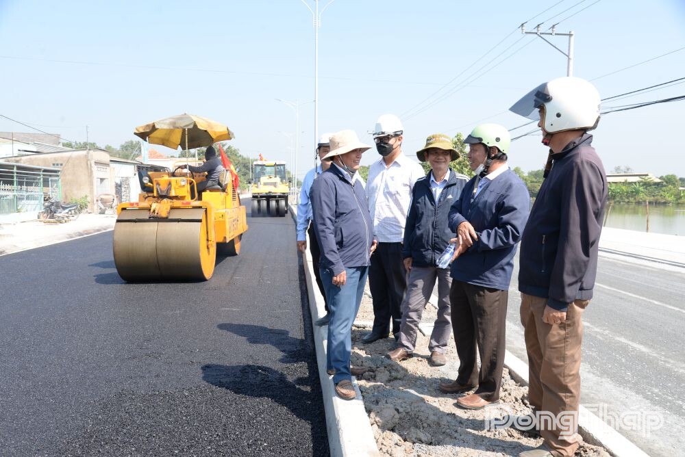 Giám đốc Ban Quản lý dự án đầu tư xây dựng công trình giao thông tỉnh Đồng Tháp Trần Minh Trung kiểm tra công tác thảm nhựa tại dự án.