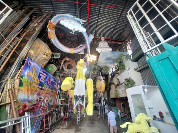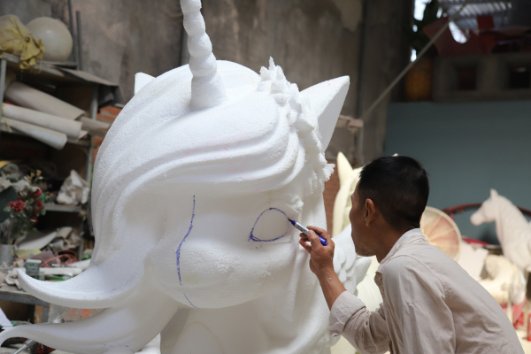 Với khả năng và kinh nghiệm lâu năm, anh Quốc Thuận sẽ là người thực hiện chính công đoạn tạo hình, chỉnh sửa khuôn mặt, đôi mắt và các phần chính của linh vật. Sau đó, các công đoạn tiếp theo sẽ là sơn keo tạo độ cứng chắc cho bề ngoài linh vật, tiếp đó là sơn màu, phủ bạc hoàn thiện sản phẩm… Trung bình mỗi sản phẩm mất từ vài ngày đến nửa tháng để hoàn thành, tùy kích thước và độ phức tạp.