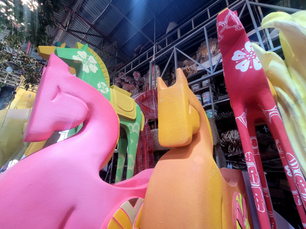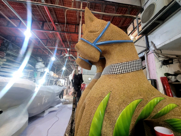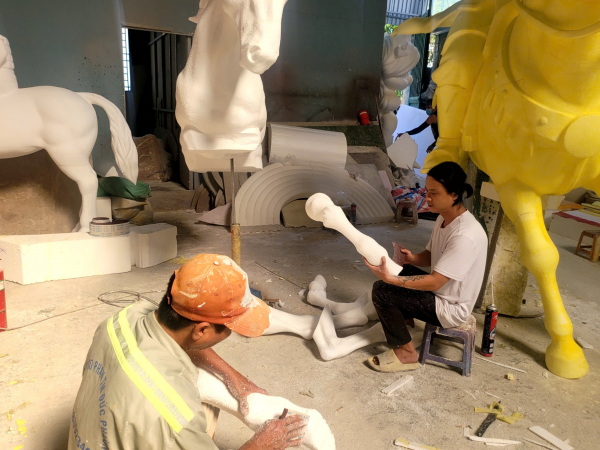 Với mẫu ngựa kích thước lớn, từng phần được cắt rời ra để chế tác rồi ghép lại hoàn thiện. Khi vận chuyển ra đường hoa, linh vật ngựa cũng được tháo rời một lần nữa.