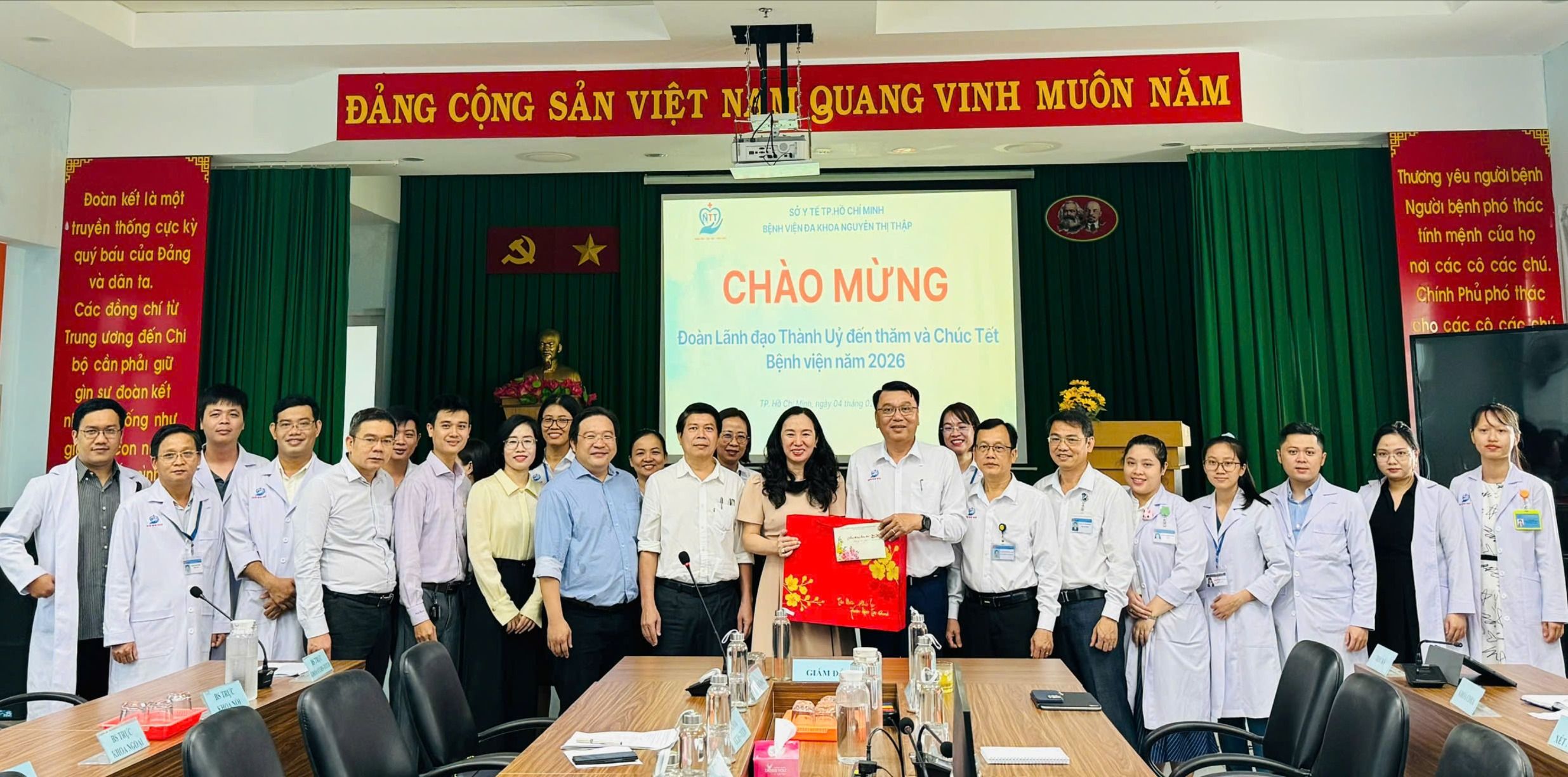 Đoàn công tác đã đến thăm Bệnh viện Đa khoa Nguyễn Thị Thập, gửi lời chúc tết và động viên đội ngũ y bác sĩ, nhân viên y tế đang làm nhiệm vụ chăm sóc sức khỏe nhân dân trong dịp cao điểm cuối năm; đồng thời mong muốn tập thể bệnh viện tiếp tục nỗ lực nâng cao chất lượng phục vụ người dân trong thời gian tới.
