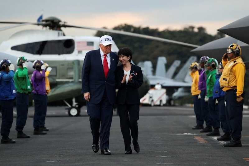 Ông Trump và bà Takaichi trên boong tàu USS George Washington. (Ảnh: Reuters)