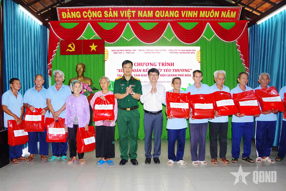 Đại diện lãnh đạo Ban chỉ huy Phòng thủ khu vực 2 - Phú Lợi trao hơn 200 phần quà, với tổng trị giá trên 50 triệu đồng tặng các đối tượng đang được chăm sóc, nuôi dưỡng tại Trung tâm Bảo trợ xã hội Chánh Phú Hòa.
