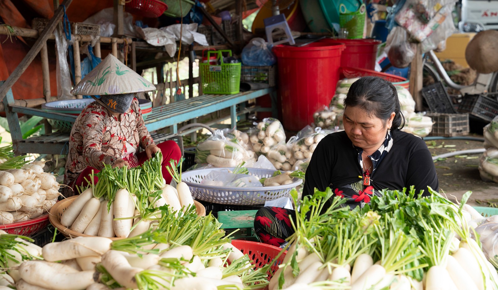 Thương lái thu mua rau màu tận nơi rồi phân phối ở các chợ lân cận.