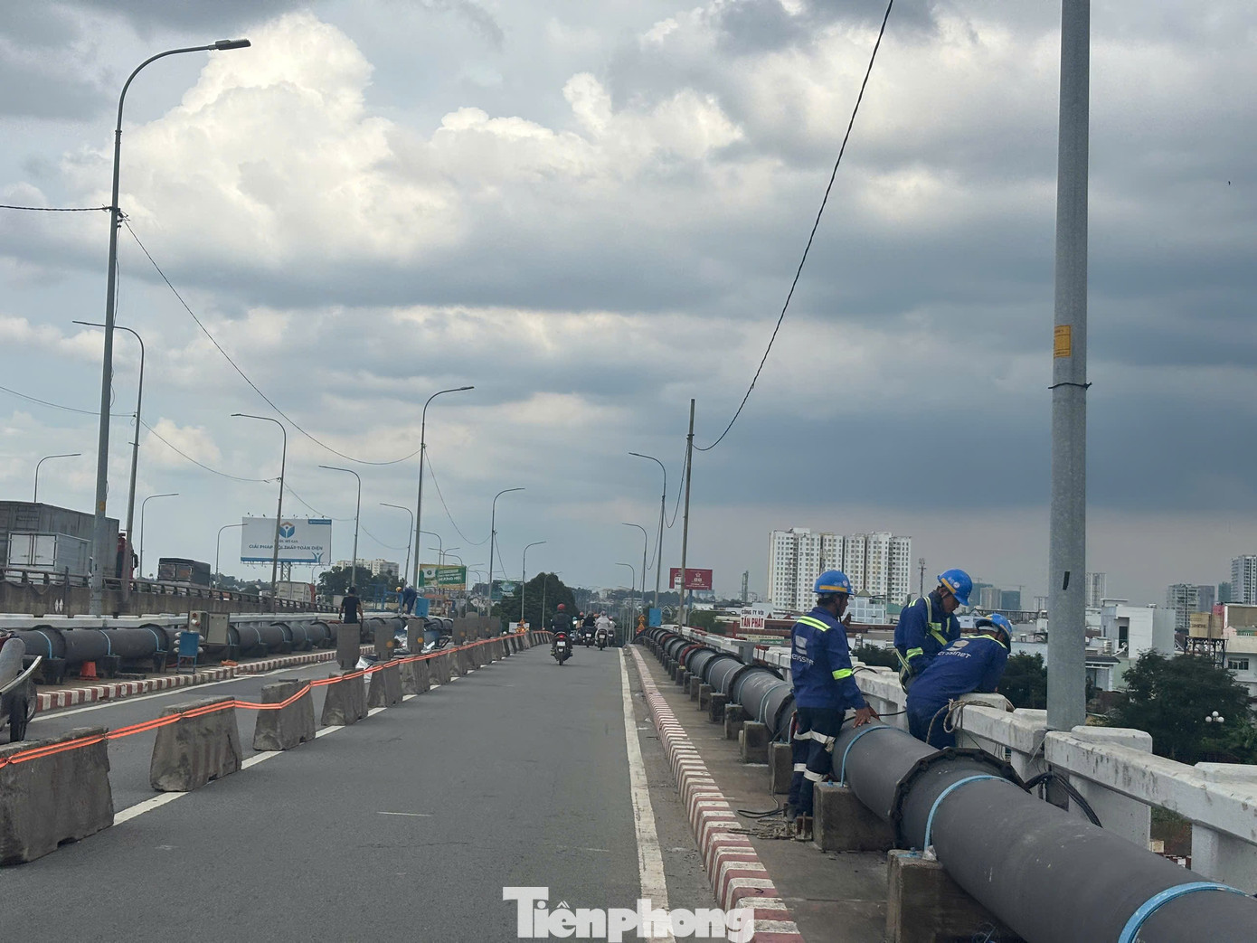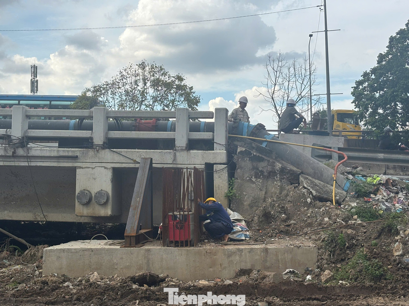 Theo ghi nhận của phóng viên, hiện nay sau khi cơ bản hoàn thành nâng tĩnh không cầu Bình Triệu 1 trên quốc lộ 13, đơn vị thi công đang triển khai lực lượng và phương tiện để nâng tĩnh không cầu Bình Phước 1 trên quốc lộ 1. Trong ảnh: Đơn vị thi công đang lắp nhịp dẫn bằng sắt ở đầu và cuối cầu để phương tiện lưu thông tạm khi triển khai công tác kích nâng tĩnh không.
