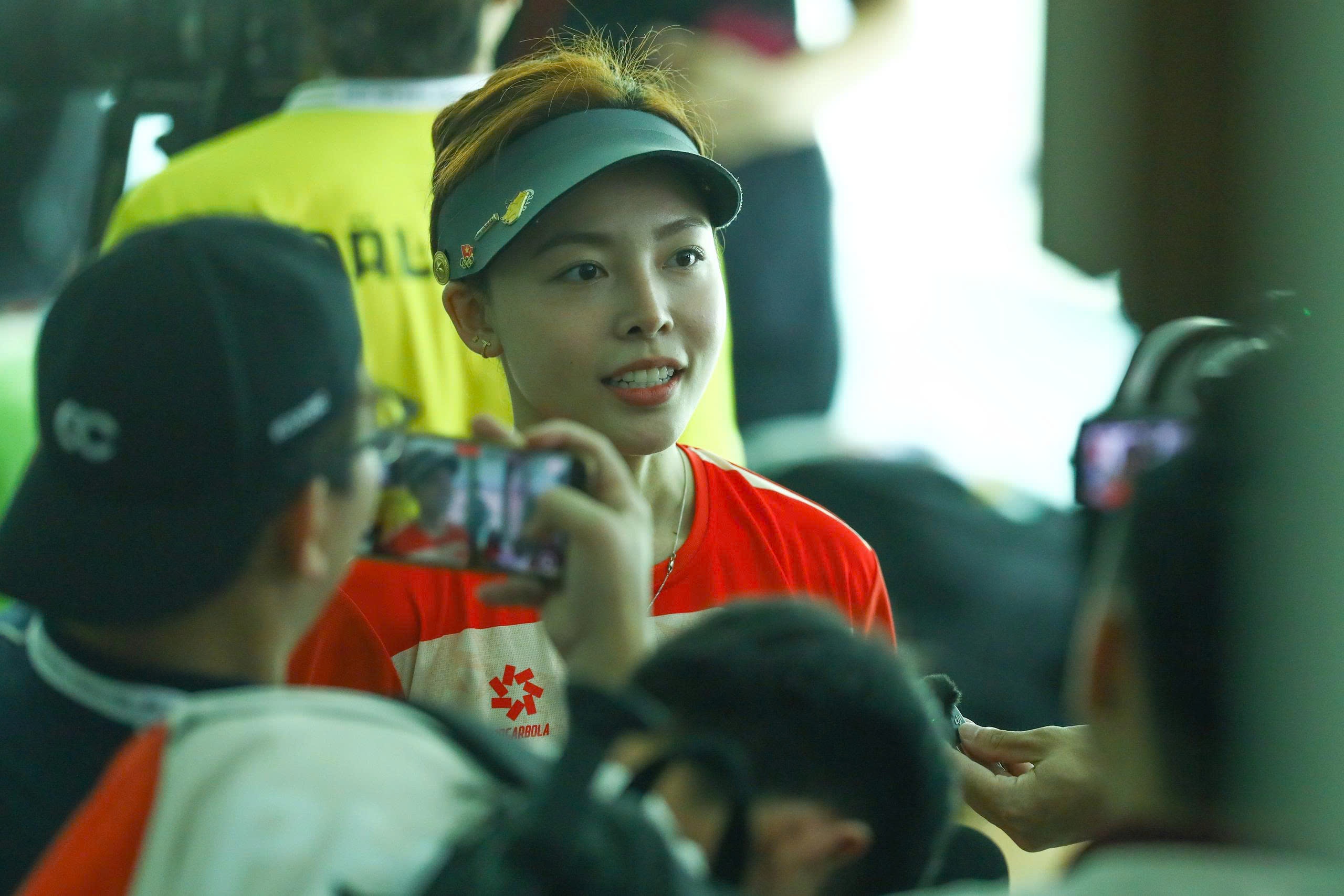 Từ lúc thi đấu đến phần giao lưu sau trận, Phí Thanh Thảo thu hút sự chú ý lớn từ những khán giả theo dõi bởi ngoại hình nổi bật và phong thái cực ngầu. VĐV sinh năm 2004 từ lâu nổi tiếng là "bông hồng thép", "hoa khôi" của làng thể thao. Ảnh: Minh Chiến.