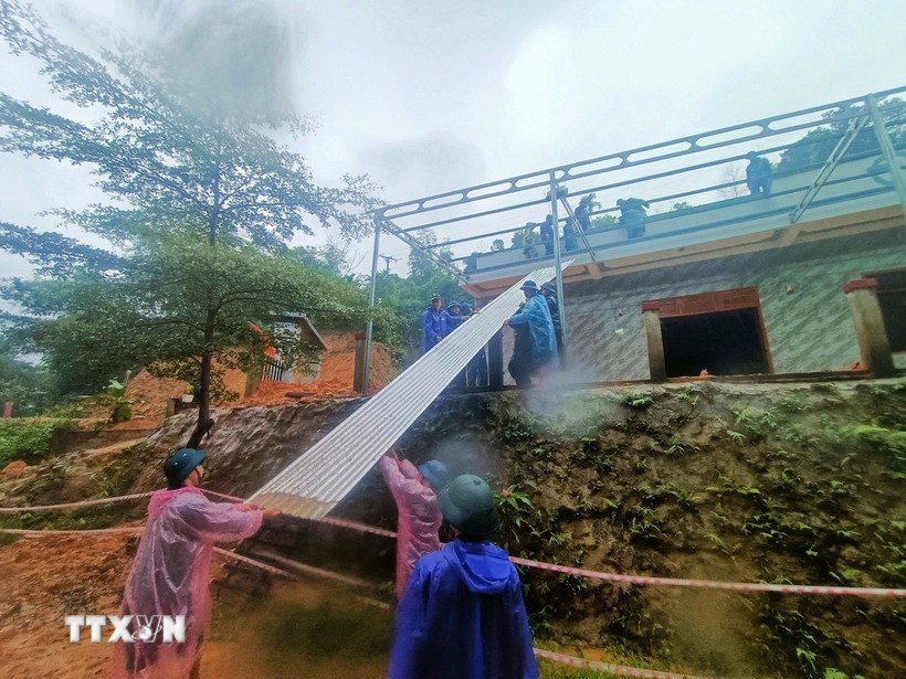 Một trong những ngôi nhà bị hư hại hoàn toàn ở xã Trà Leng đang được xây dựng mới. Ảnh Đoàn Hữu Trung/TTXVN
