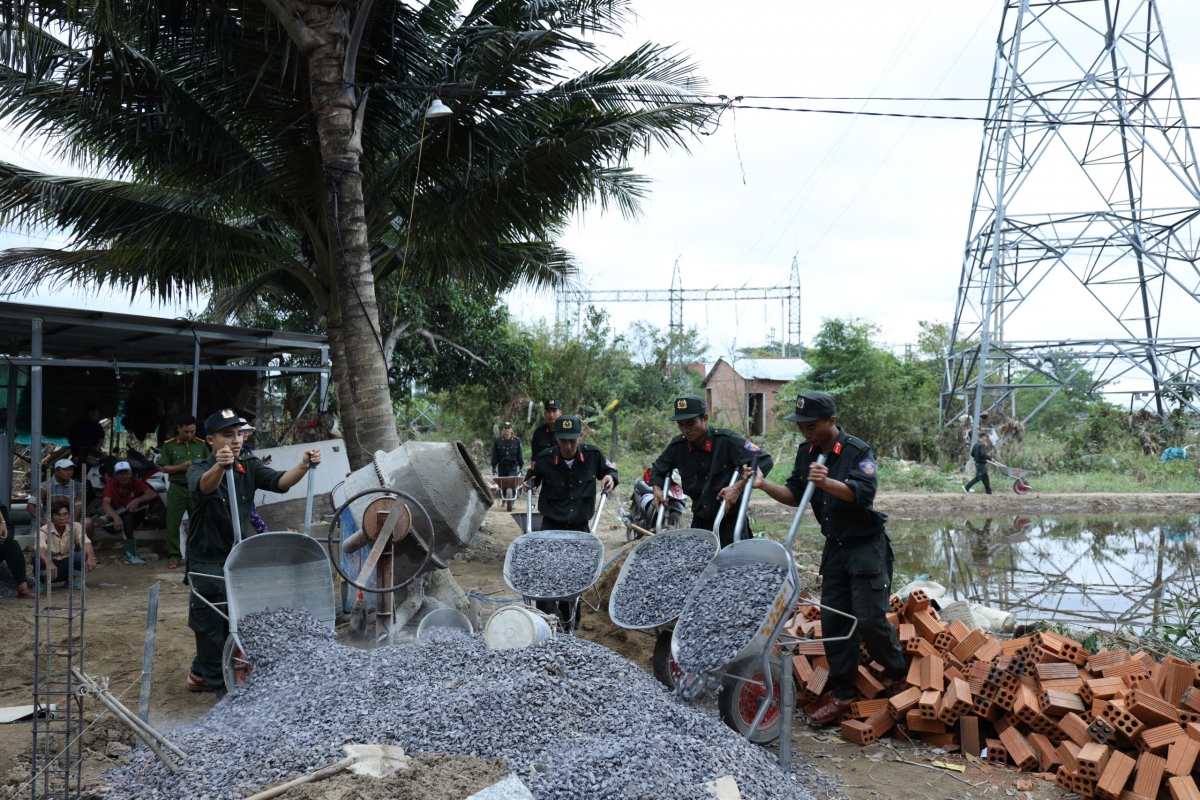 Không chỉ quân đội, tại “rốn lũ” Diên Điền, lực lượng công an cũng có mặt ở từng ngõ xóm. Trong đêm lũ, họ dầm mình trong nước xiết để đưa từng cụ già, từng cháu nhỏ đến nơi an toàn. Khi nước rút, họ lại cùng dân dọn bùn, tháo dỡ phần hư hỏng, vận chuyển vật liệu vào từng điểm dựng nhà. Đoạn đường chỉ hơn một cây số nhưng lầy lội, chiến sĩ Trung đoàn Cảnh sát cơ động Nam Trung bộ và của tỉnh phải đẩy từng bao xi măng, từng viên gạch trong chiếc xe rùa trơn trượt.
