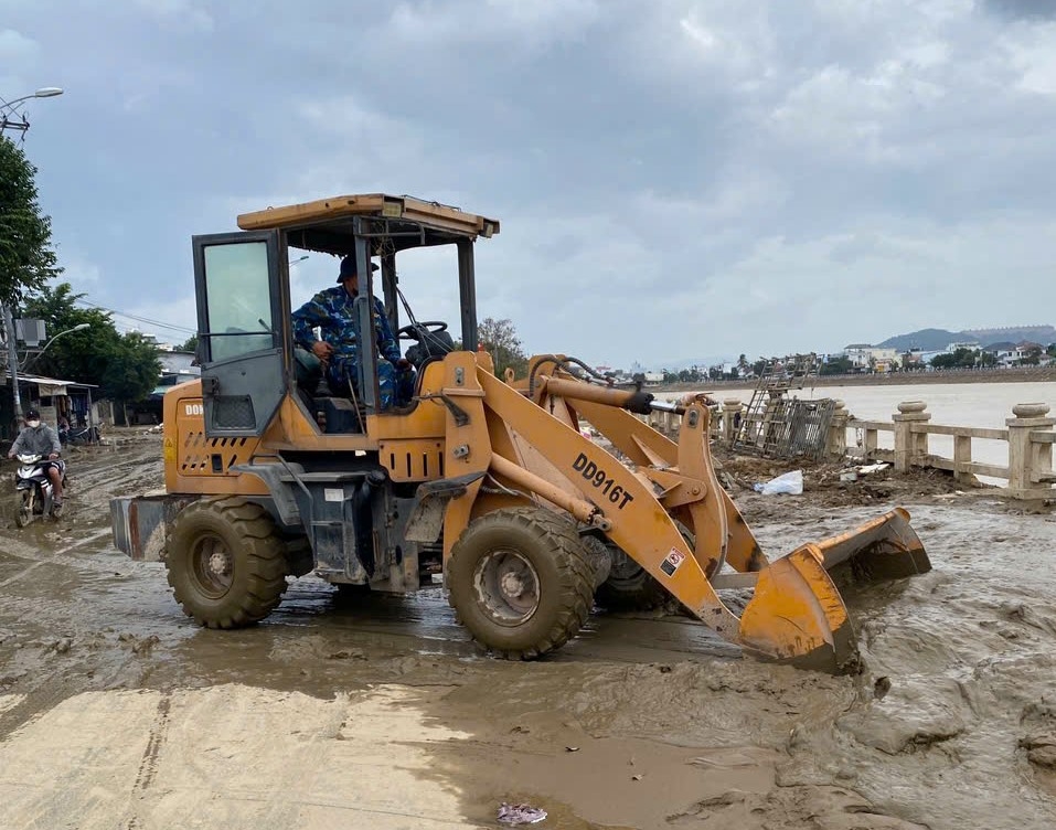 Trường Sỹ quan Không quân huy động thiết bị dọn dẹp mở đường tại xã Diên Khánh, tỉnh Khánh Hòa