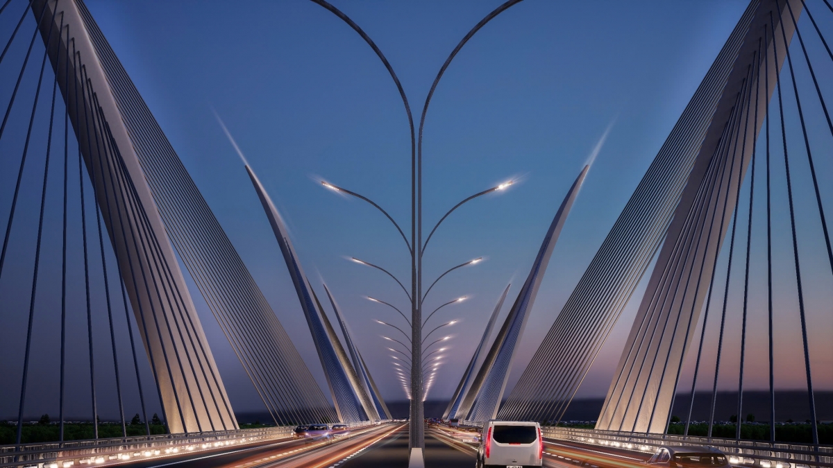 Các trụ cầu với thiết kế chữ V – điểm nhấn kiến trúc “Cánh chim hòa bình” của cầu Thượng Cát.