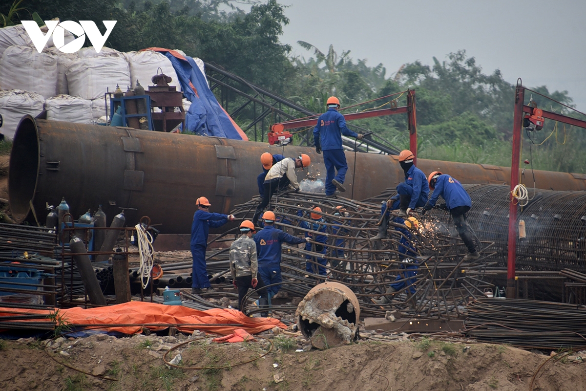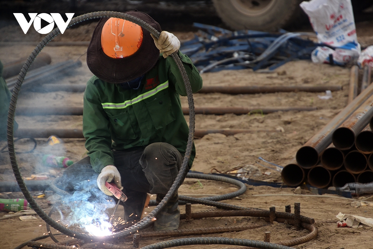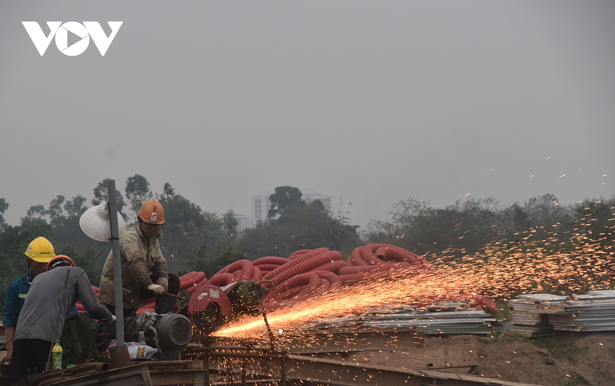 Tia lửa đỏ rực trên công trường cầu Thượng Cát thể hiện quyết tâm của công nhân tăng tốc thi công.