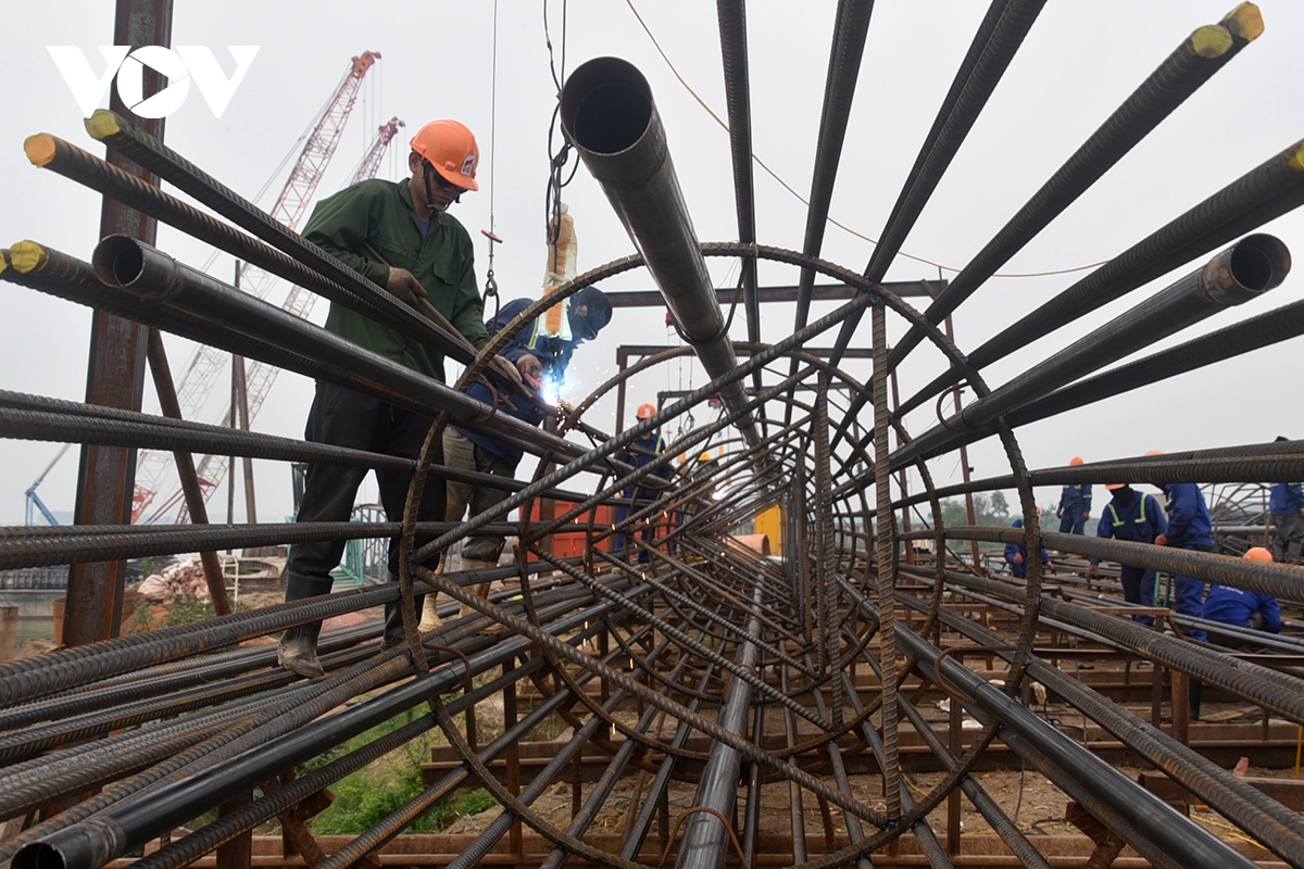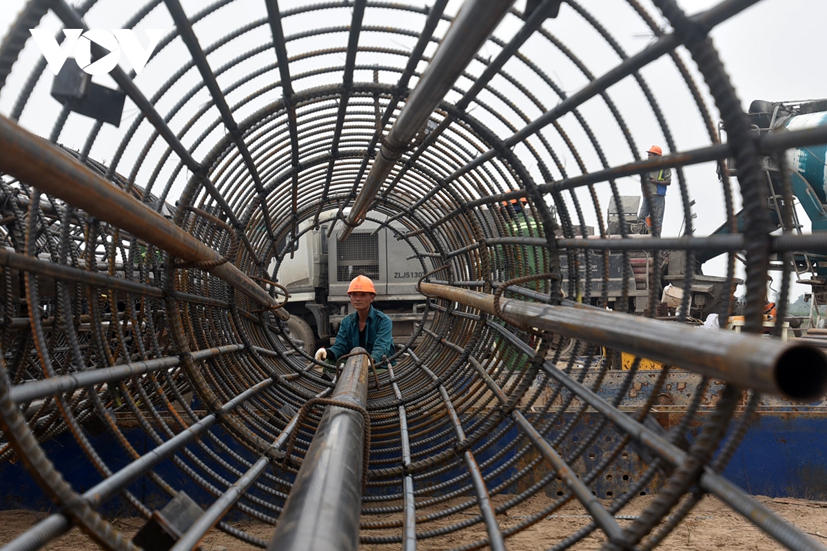 Những khung cốt thép lớn được công nhân đan kết phục vụ thi công cọc khoan nhồi.