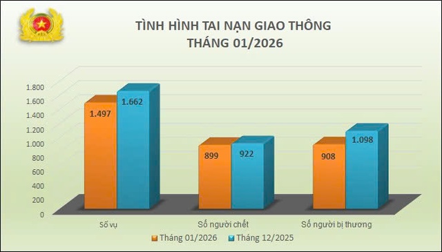 Toàn quốc xảy ra 1.497 vụ, làm chết 899 người, bị thương 908 người. So với tháng 12/2025, giảm 165 vụ (-9,93%); giảm 23 người chết (-2,49%); giảm 190 người bị thương (-17,30%).
