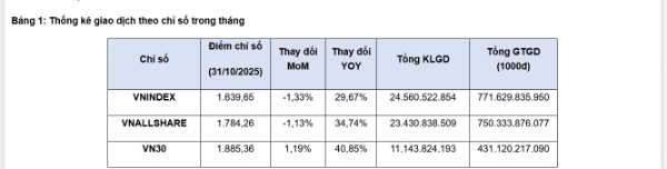 Cụ thể: kết thúc phiên giao dịch 31/10/2025, chỉ số VNIndex đạt 1.639,65 điểm, VNAllshare đạt 1.784,26 điểm và VN30 đạt 1.885,36 điểm. Trong tháng 10, ngoại trừ chỉ số VN30 ghi nhận tăng điểm, với mức tăng 1,19%, các chỉ số VNIndex và VNAllshare đều ghi nhận giảm điểm nhẹ so với tháng trước, với mức giảm lần lượt là 1,33% và 1,13%.