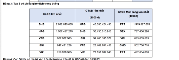 Giao dịch của nhà đầu tư nước ngoài: Tổng giá trị giao dịch của nhà đầu tư nước ngoài trong tháng 10/2025 đạt trên 189.242 tỷ đồng, chiếm 12,26% tổng giá trị giao dịch của toàn thị trường. Nhà đầu tư nước ngoài đã thực hiện bán ròng trong tháng với giá trị hơn 22.191 tỷ đồng.