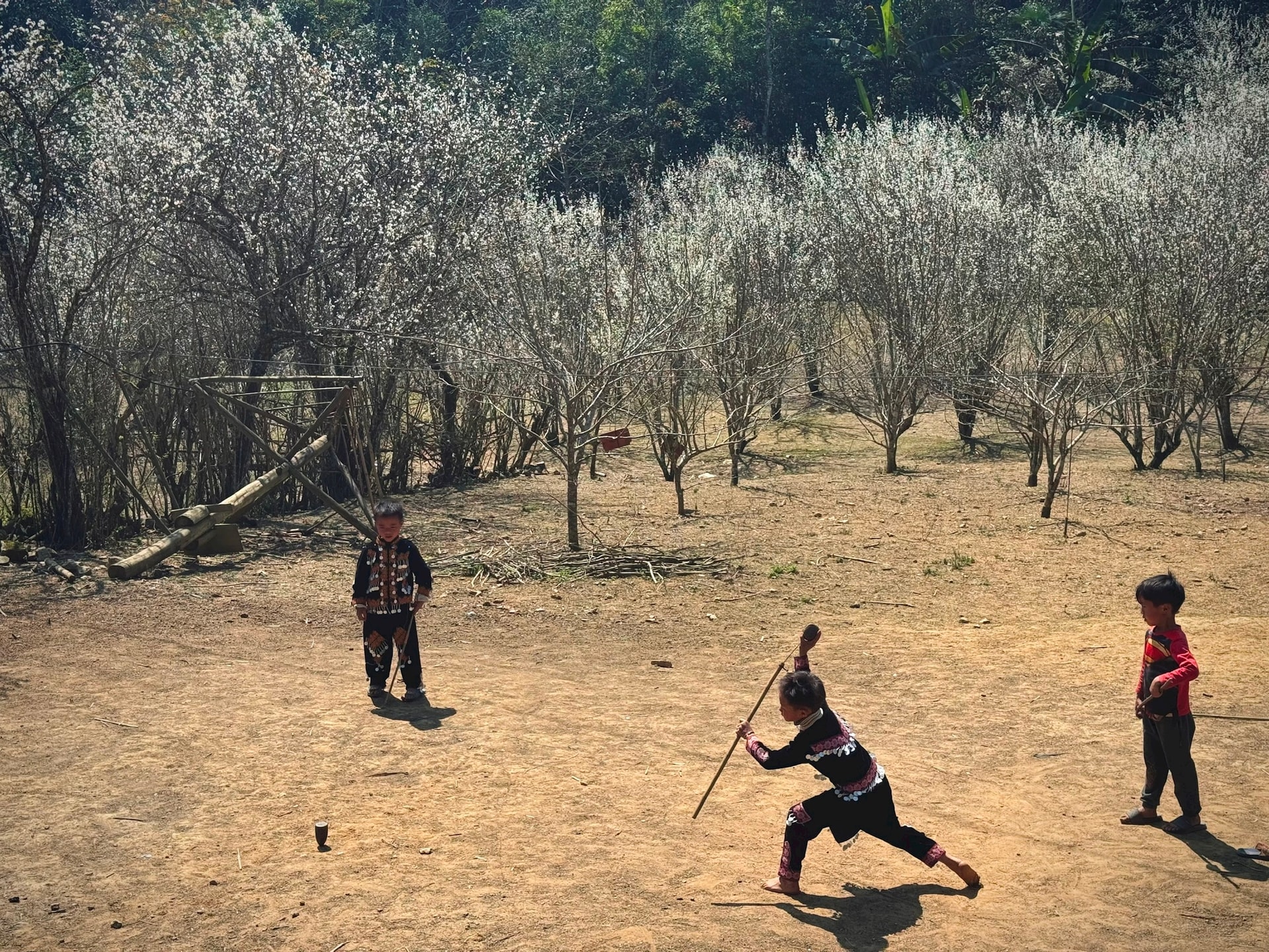 Hình ảnh những bạn nhỏ vùng cao chơi quay gỗ trong rừng mận cổ tích. Ảnh: Oanh Đỗ